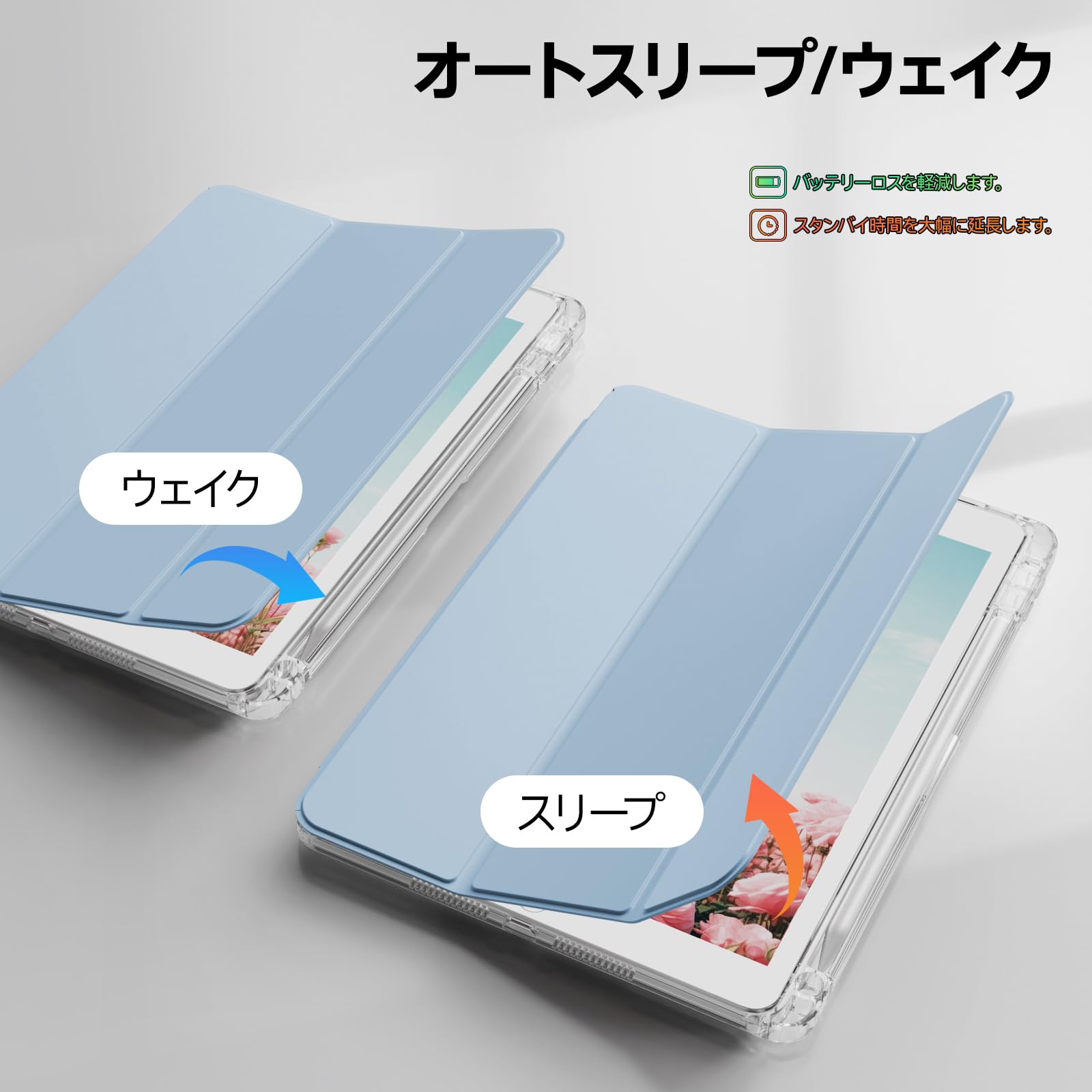 ღ「オートスリープ機能」ケースの開閉より自動的にウェイク・スリーブになるスマートなオートスリープ機能がついており、バッテリーの消耗を減少し、待機時間の延長には一役を立ってくれます。 (オートスリープの設定方法:「設定」の「画面表示と明るさ」から「ロック/ロック解除」をオンにします。)