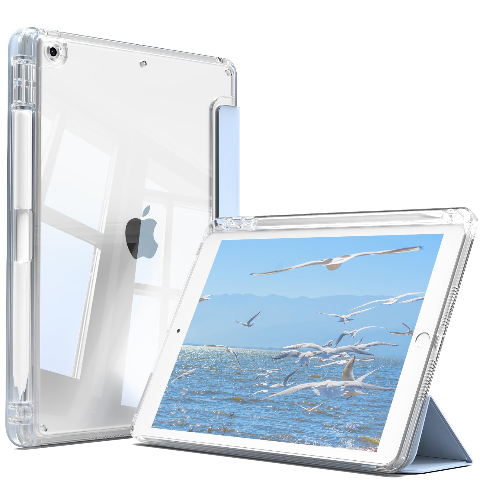 GKABXY iPad 9世代 ケース iPad 第9/8 /7世代 ケース 2021/2020/2019モデル iPad 10.2 カバー クリア 透明ハードバックカバー ペンシル収納 三つ折り スタンド オートスリープ機能付き 傷防止 軽量 着脱簡単 耐久 PUレザー TPU ブルー
