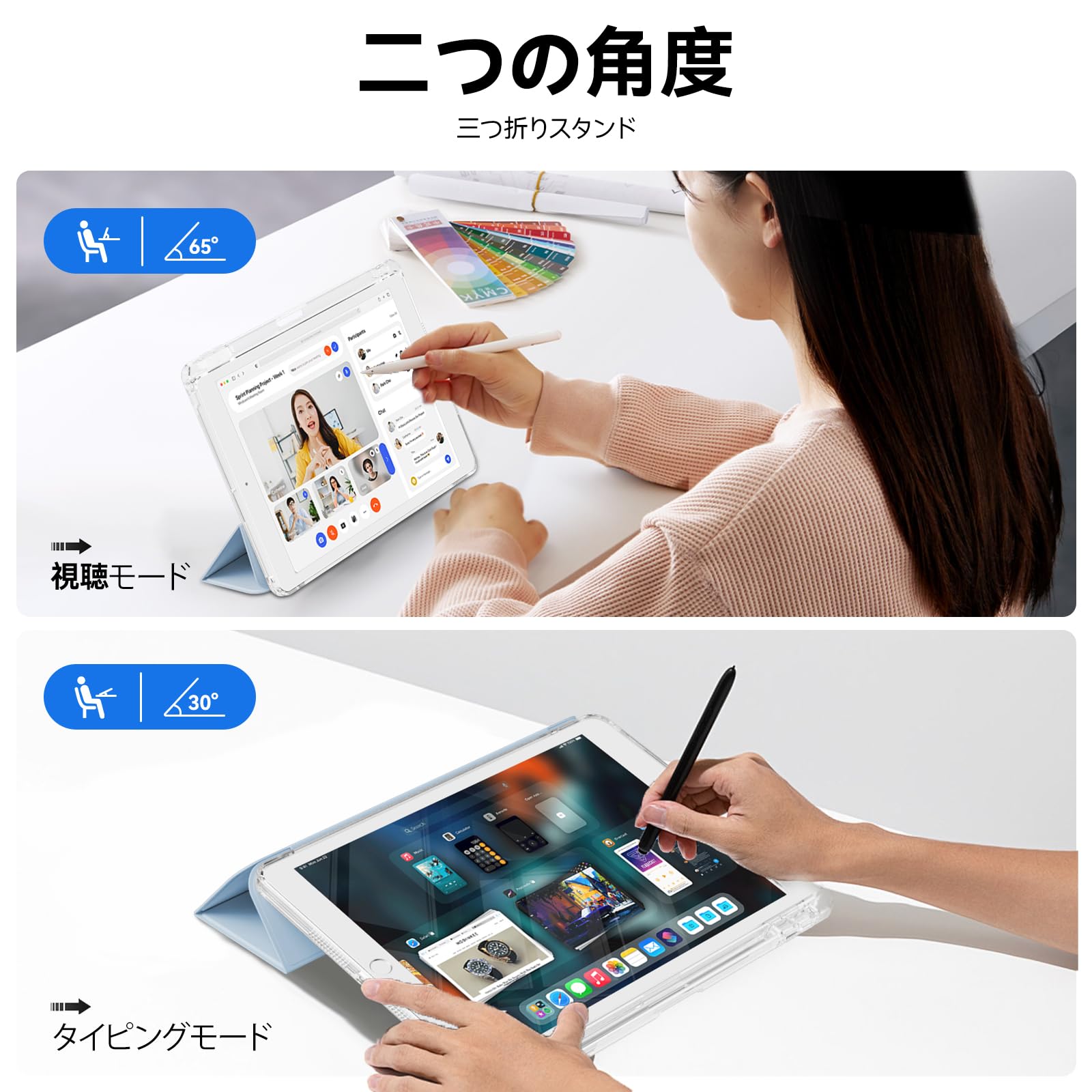 ღ「2Way スタンド機能」動画鑑賞や文字入力などに最適な2通りのスタンドになります。iPadを立てて使用する際にしっかりサポートし、安定した角度を維持したまま快適にご利用いただけます。