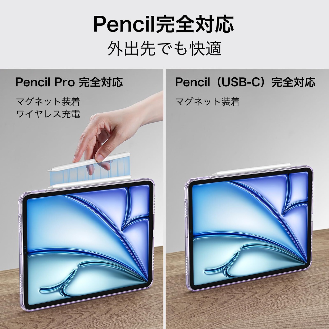 【Pencil Pro&Pencil (USB-C)対応】:Pencil Pro磁気ペアリングおよび埋め込み式の充電コネクタによる吸着充電に完全対応しています。*注意:右側のTPUは薄いので、強く引っ張らないでください。
