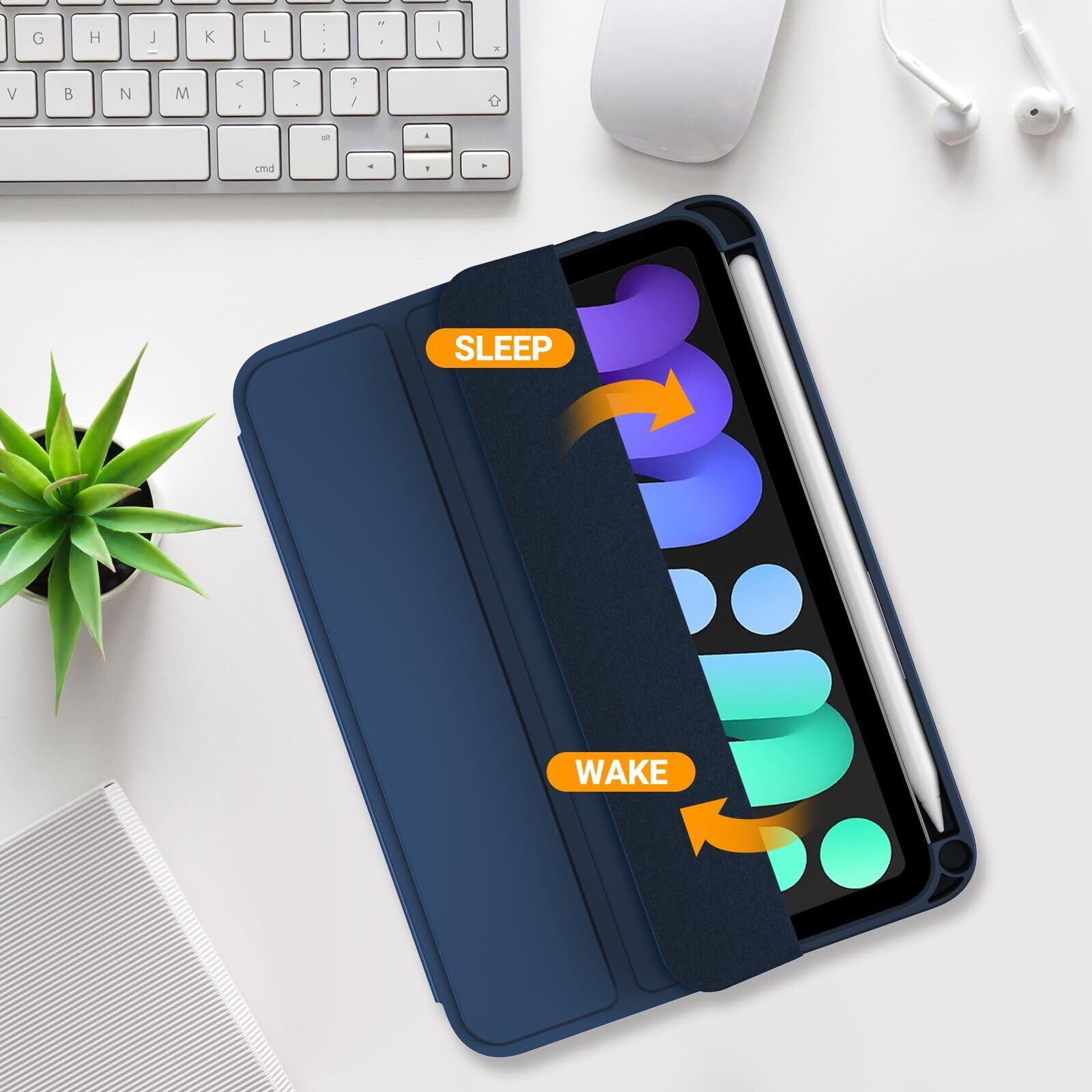 ProCase iPad Mini A17 Pro 第7世代 (2024発売) Mini6 第6世代 (2021発売) ケース 8.3インチ ペンホルダー付き オートスリープ/ウェイク機能 耐衝撃 三つ折りスタンド 適用機種:iPad Mini A17 Pro 第7世代 2024、iPad Mini 6世代 2021 - ダークブルー
