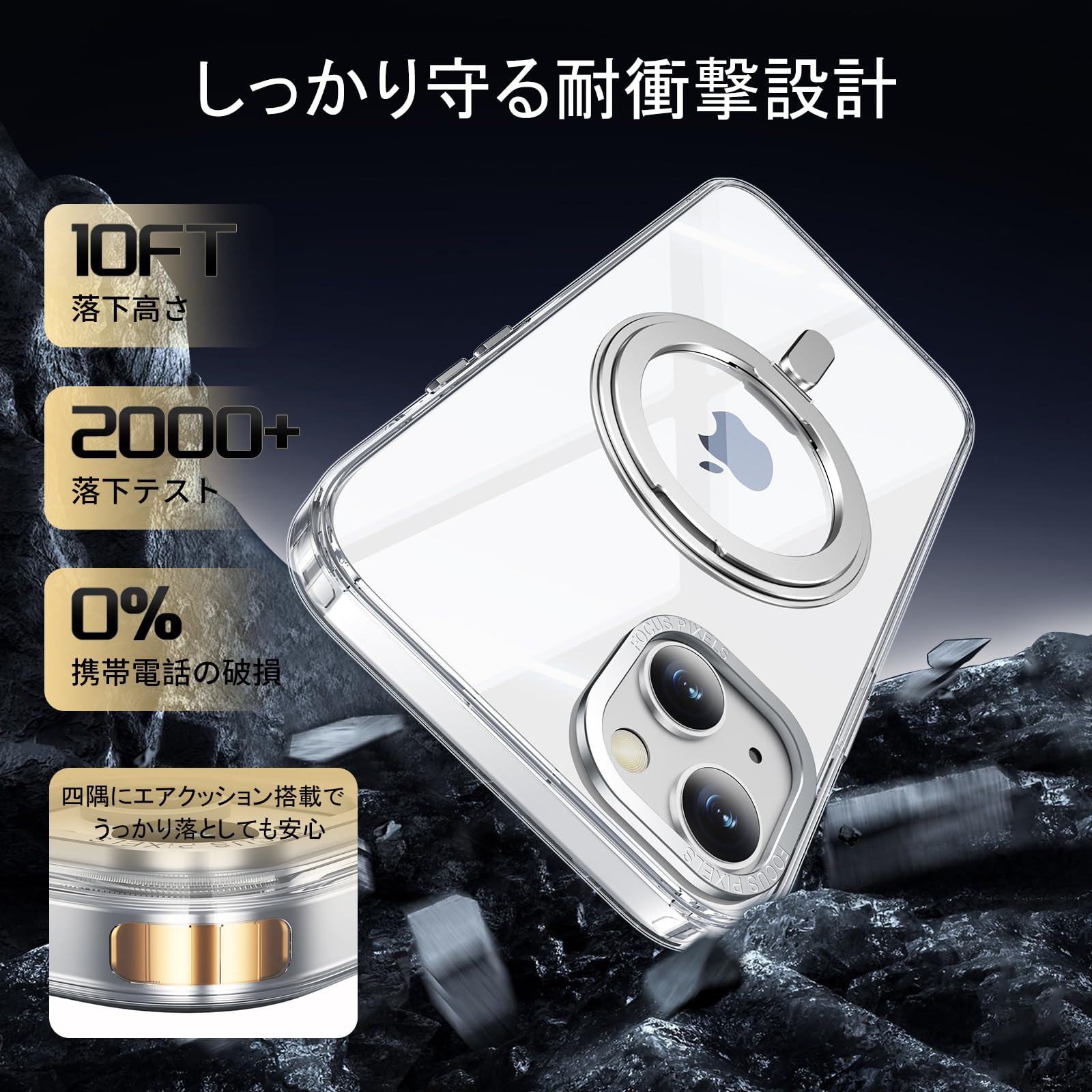 「Magsafe対応」ケースをつけたままマグセーフ機能を快適に使用できます。背面に薄くて強いマグネット内蔵しています、ワイヤレス充電や車載ホルダーやアクセサリとのあらゆる充電に安定で接着ができ、差し込みのいらないより簡単により素早く充電できます。「全てのMagSafe付きデバイス対応、Qi充電には対応していません。」