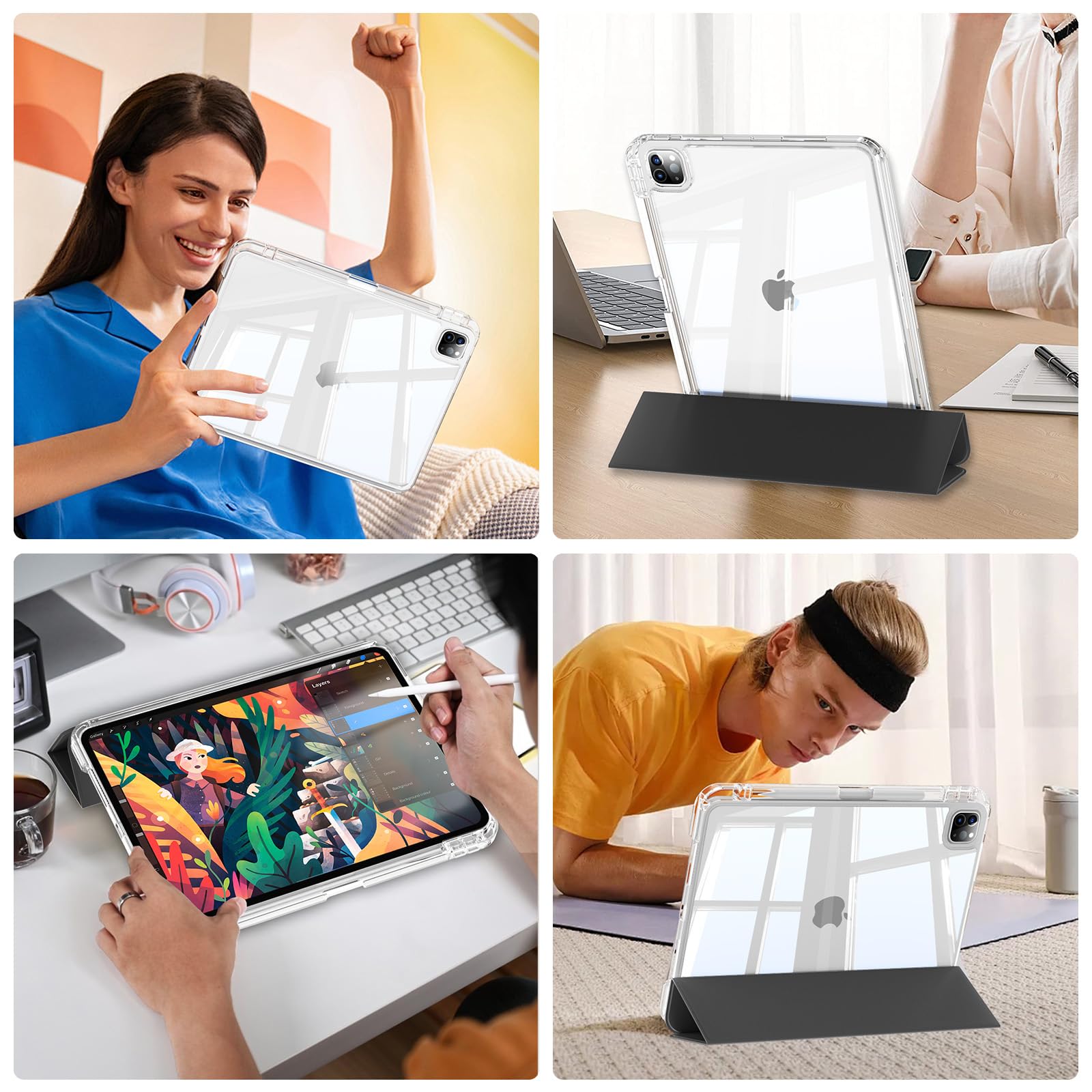 GKABXY iPad Air 13インチ ケース (M3/M2) 2025/2024 iPad Pro 12.9インチ 第6 / 5 / 4世代 分離式 ケース 2022 2021 2020 取り外し可能 透明 クリアカバー アクリル 縦置き/横置きスタンド ペンシル収納 耐衝撃 軽量 精密設計 着脱簡単 アイパッド ブラック