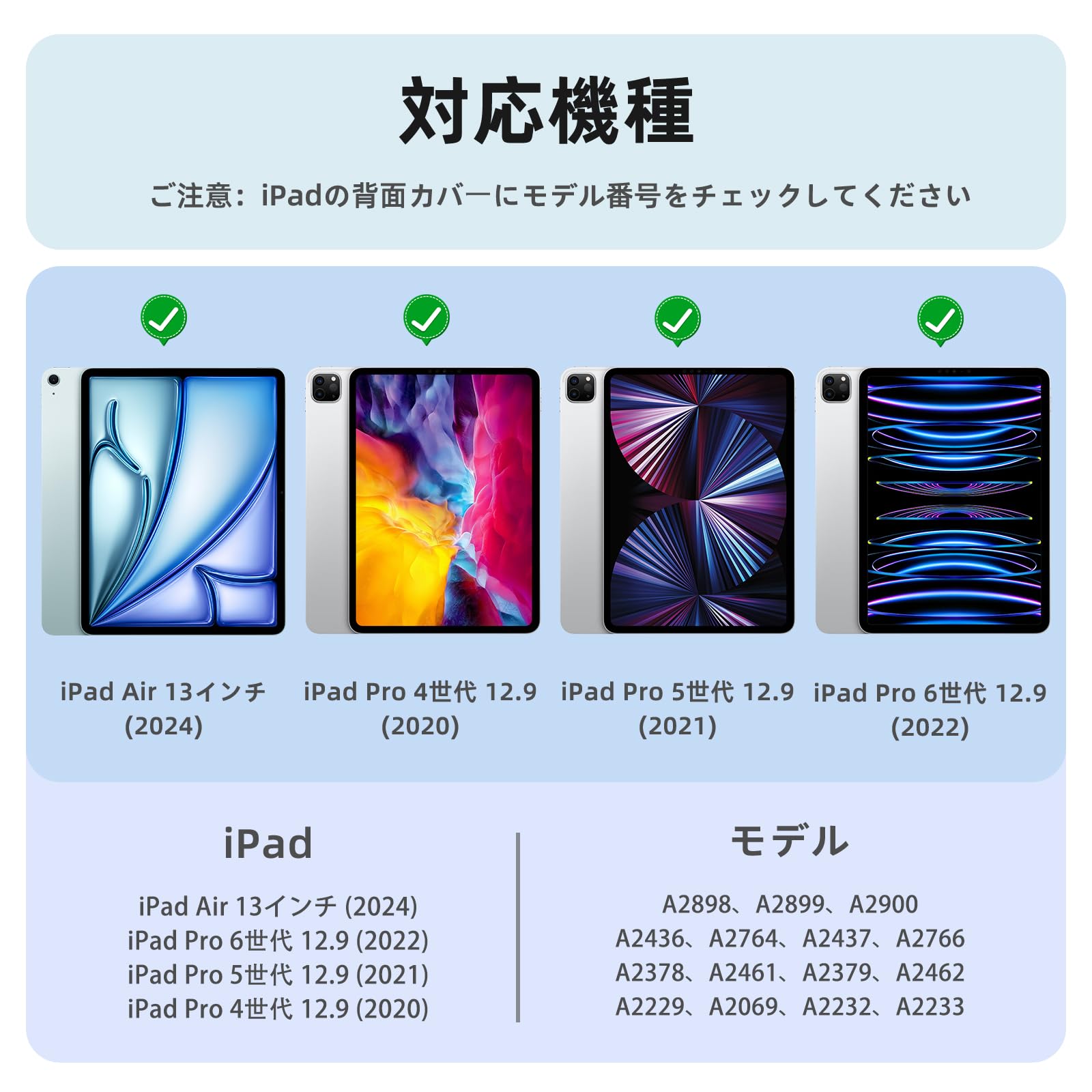 ❛‿˂̵✧「対応機種」iPad Air 13インチ 2025/2024(A3268、A3269、A3271、A2898、A2899、A2900)/12.9インチのiPad Pro 第6世代 2022(A2436、A2764、A2437、A2766)/iPad Pro 第5世代 2021(A2378、A2461、A2379、A2462)/iPad Pro 第4世代 2020(A2229、A2069、A2232、A2233) 専用です。 他のモデルに適用されません。ご購入前、お持ちのiPadのモデル番号をご確認いただきます。