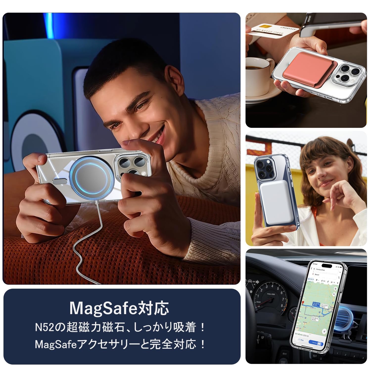 「Magsafe対応」ケースをつけたままマグセーフ機能を快適に使用できます。背面に薄くて強いマグネット内蔵しています、ワイヤレス充電や車載ホルダーやアクセサリとのあらゆる充電に安定で接着ができ、差し込みのいらないより簡単により素早く充電できます。