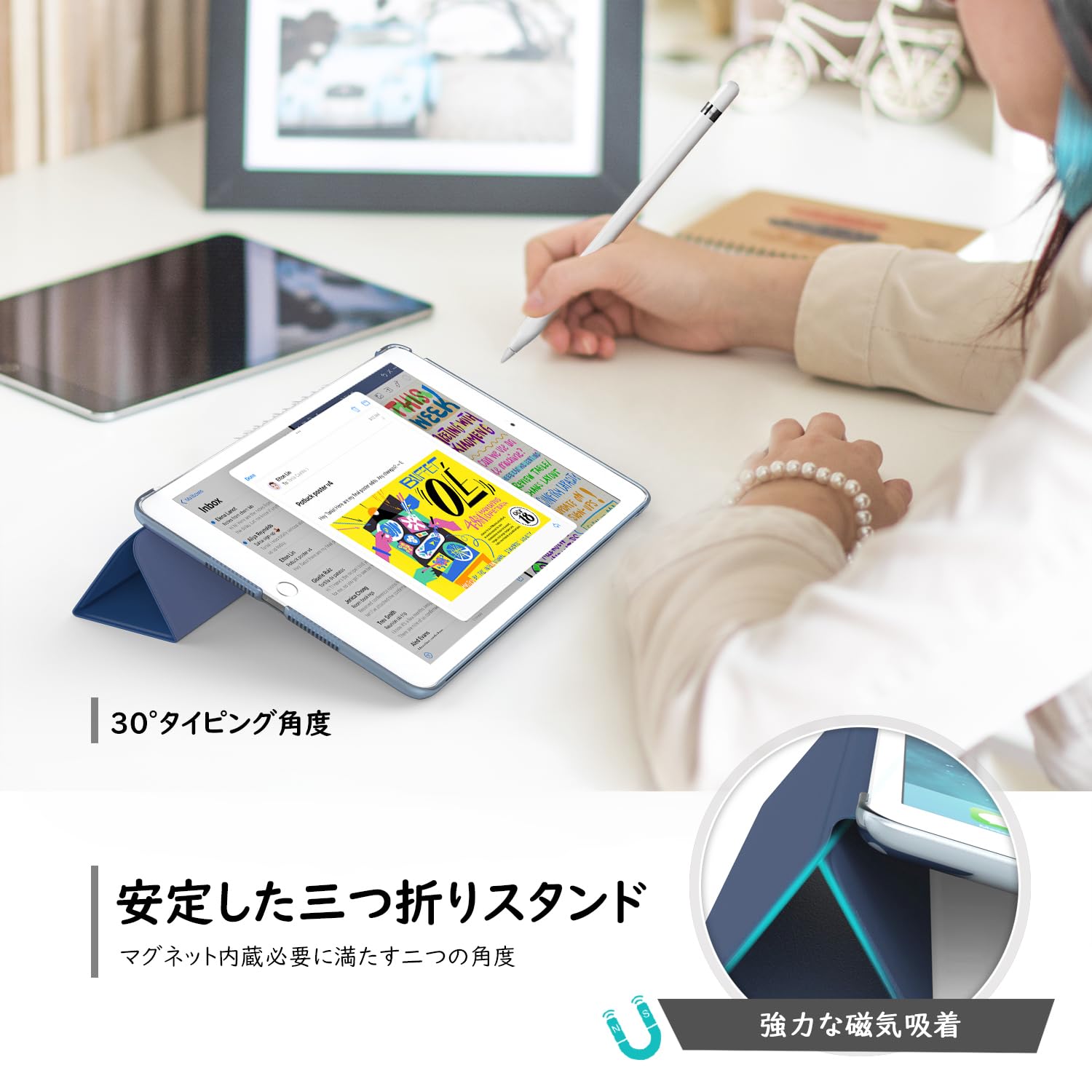 【三折りスタンド式】 三つ折りのフロントには、複数のマグネットが均等に内蔵されています。ご大切なiPadを立てて使用する際にしっかりサポートし、安定した角度を維持したまま快適にお使いいただけます。