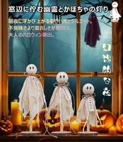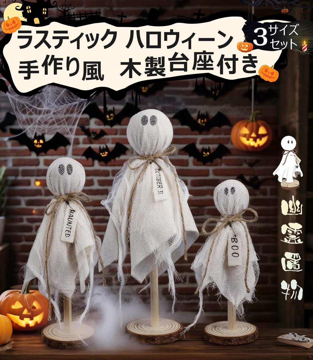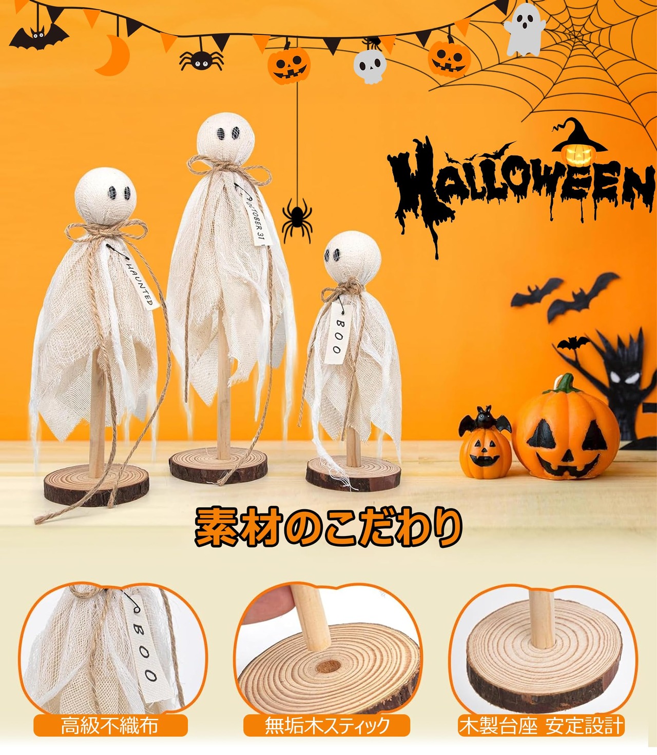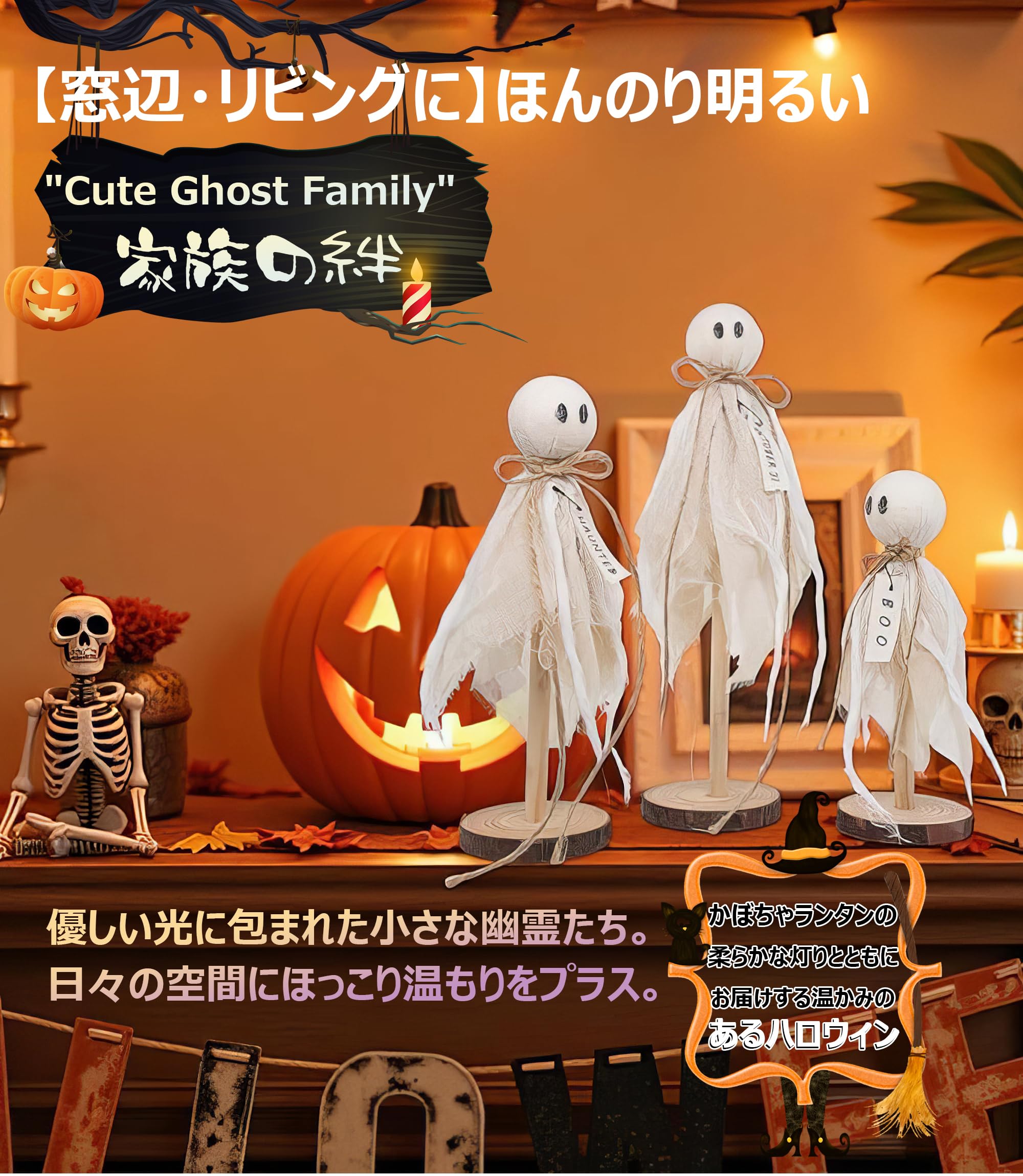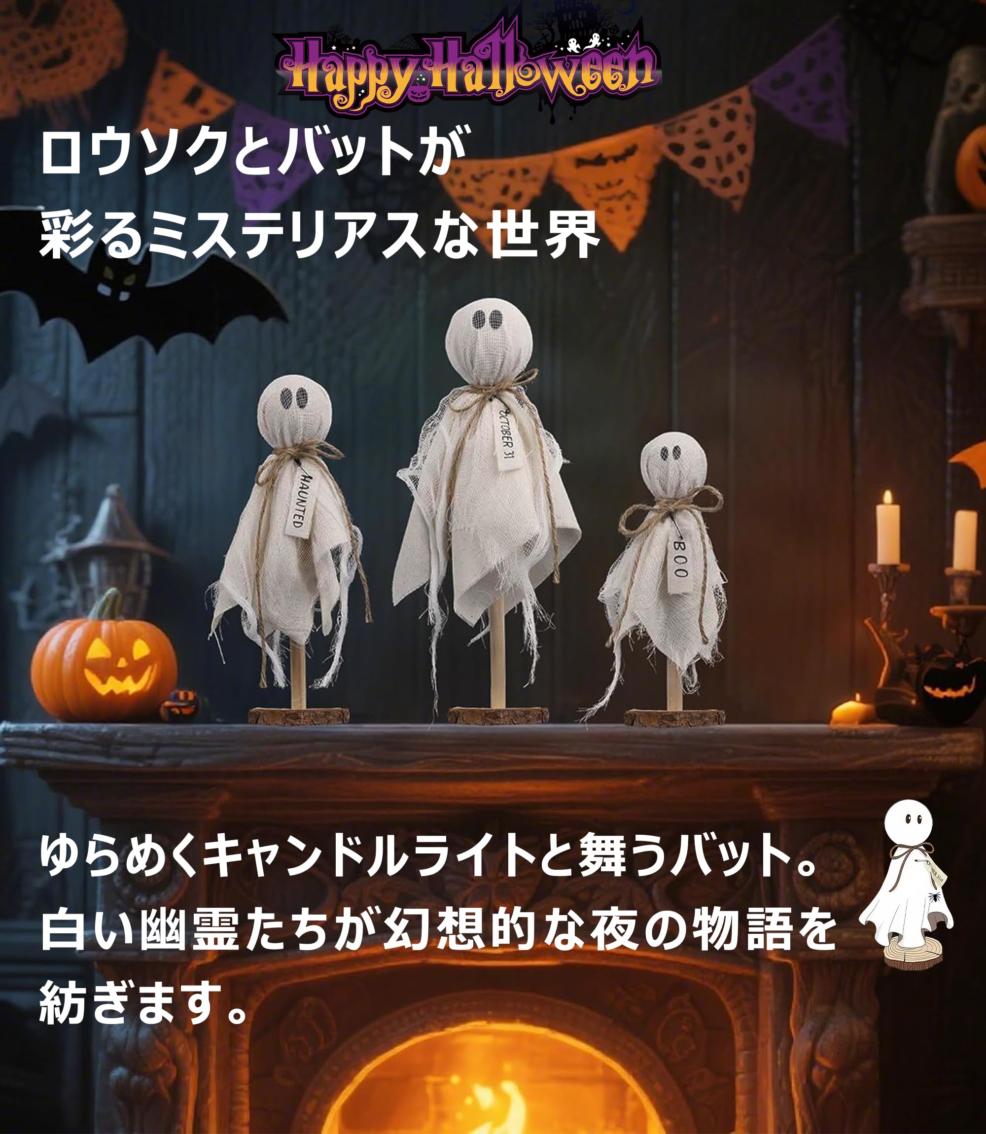 手作り風ハロウィン置物3点(BOO・OCT31・HAUNTED付き)の「ふわふわ浮遊感!白おばけガーランドで彩る ほの暗い温もりインテリア」
