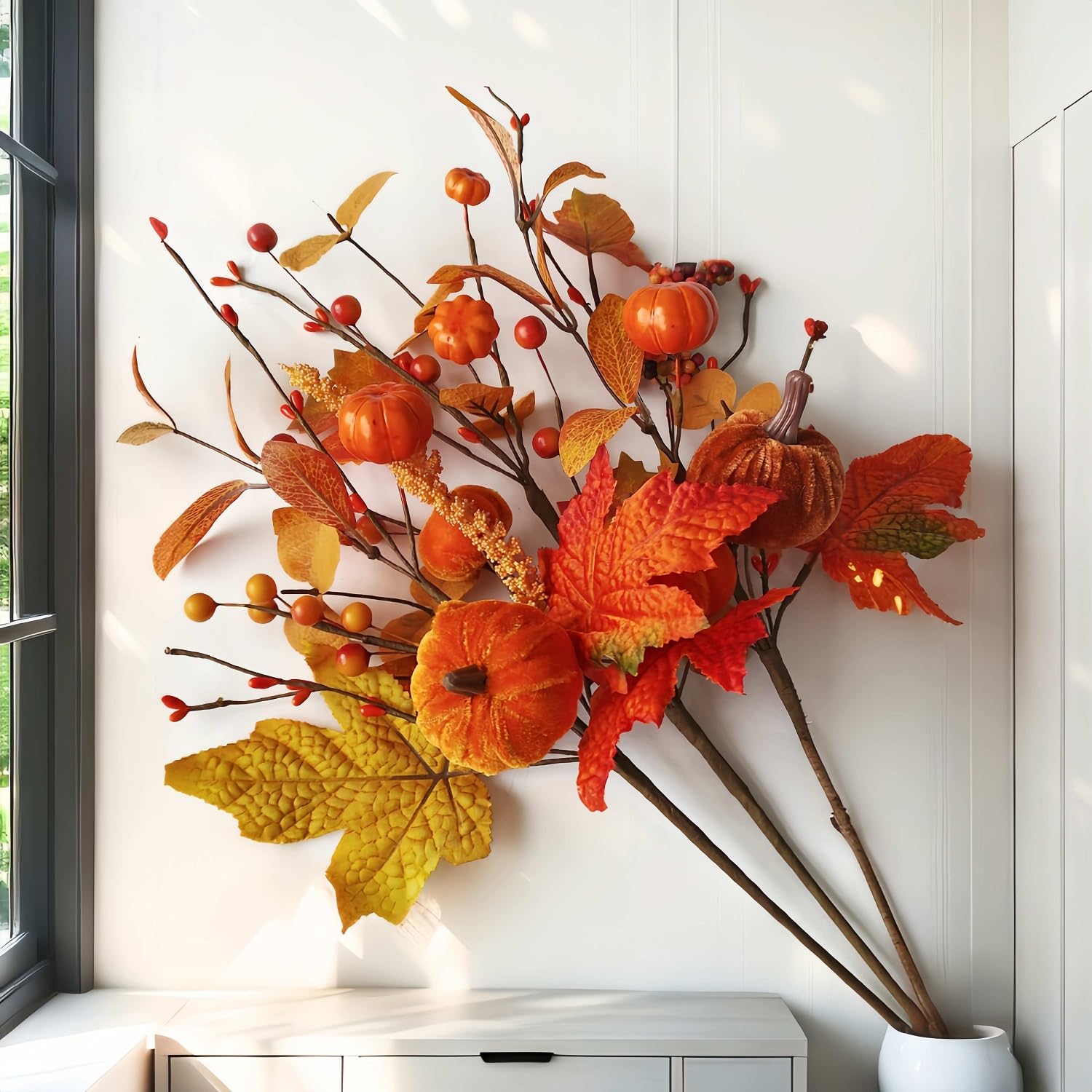 「秋の装飾」:パンプキン、カエデの葉、ベリーなど、秋を代表するモチーフを1本に集約。これ1つで一気に季節感を演出でき、手軽ながら存在感のある装飾が完成します。
