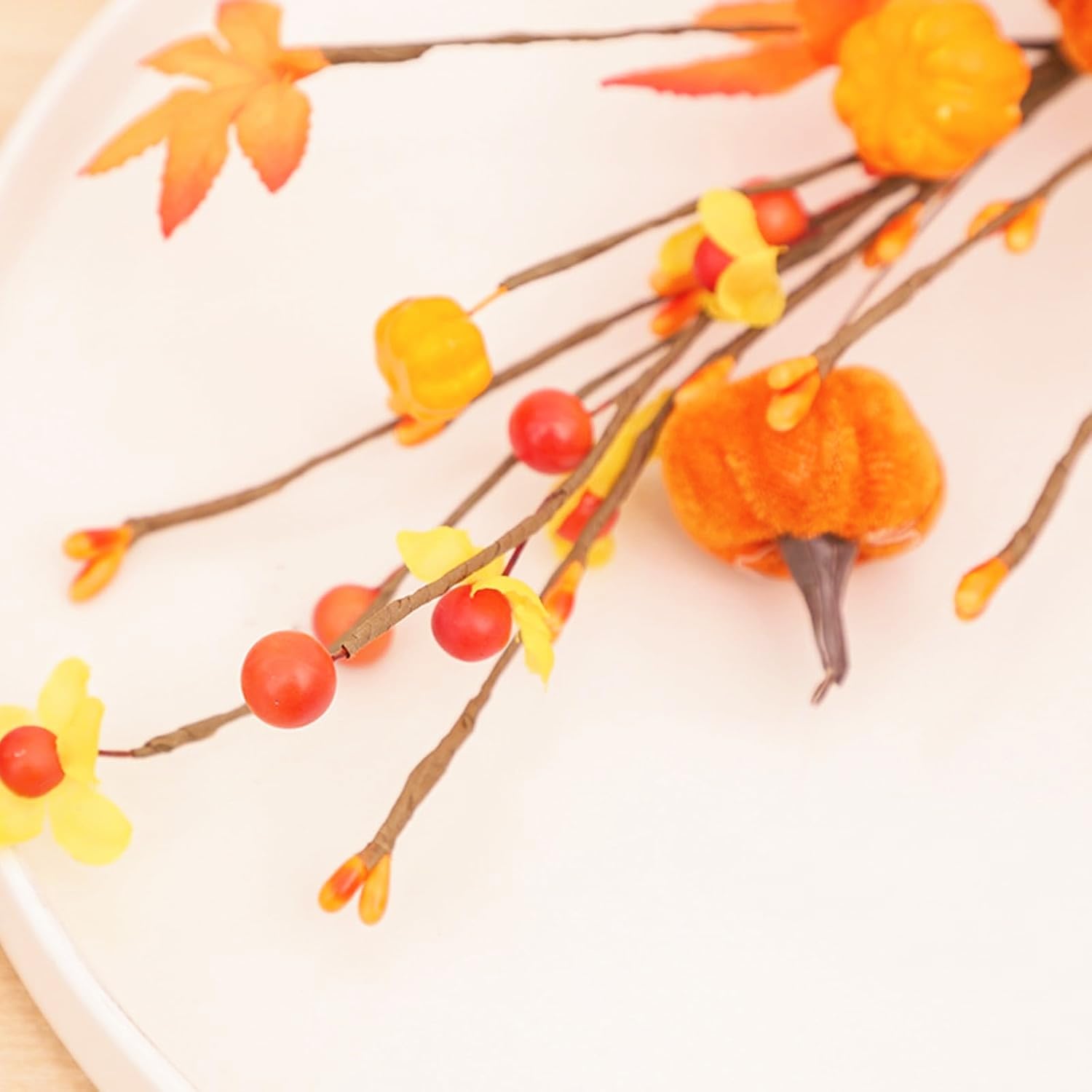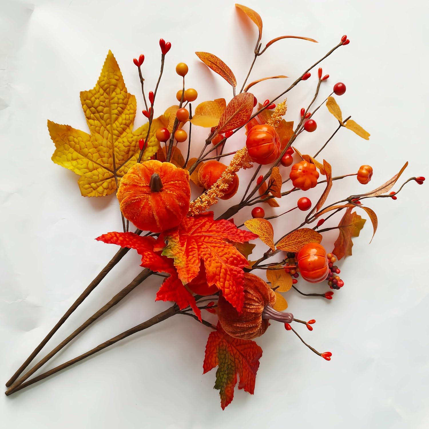 koundeneko ハロウィン造花 パンプキンピック 2本セット カボチャ カエデの葉 ベリー 組み合わせ 人工枝 ブーケ 秋 季節飾り 感謝祭 ホーム テーブルセンター インテリア 撮影小道具