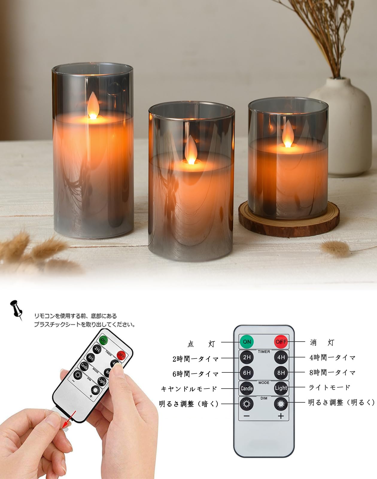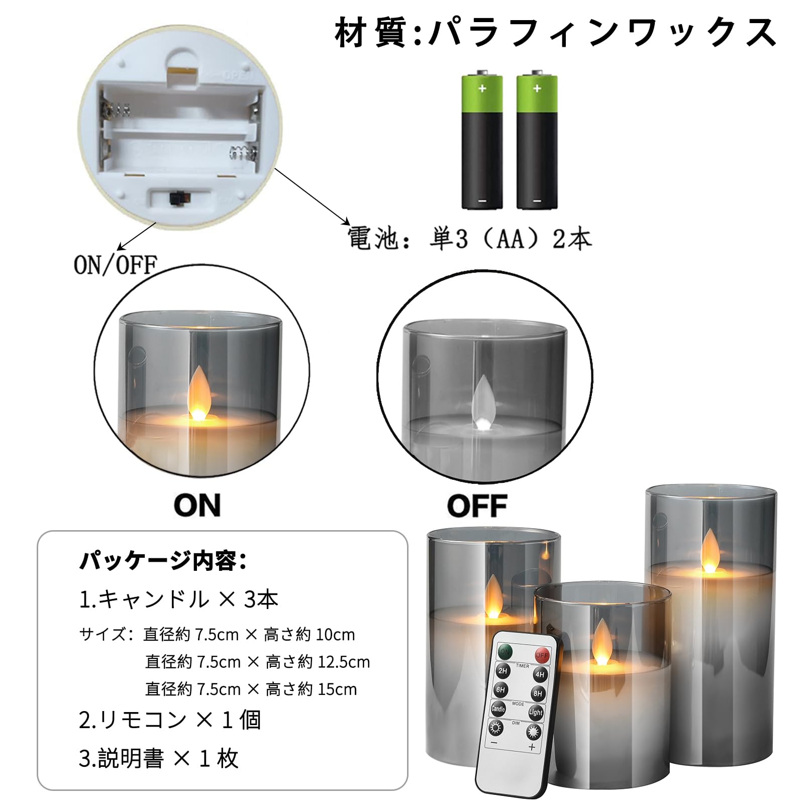 【使用便利】1) 2本のAA電池(含まれていません)を各キャンドルのバッテリーハウスに入れてから、「オン」スイッチに移動します。2) IRリモコン(CR2025電池を含む)を使って、タイマー機能などのキャンドルをコントロールできます。タイマーモード:2時間/4時間/6時間/8時間の自動消灯タイマー設定可, 1つのリモコンで距離が6M未満であれば、すべてのキャンドルをコントロールできます。