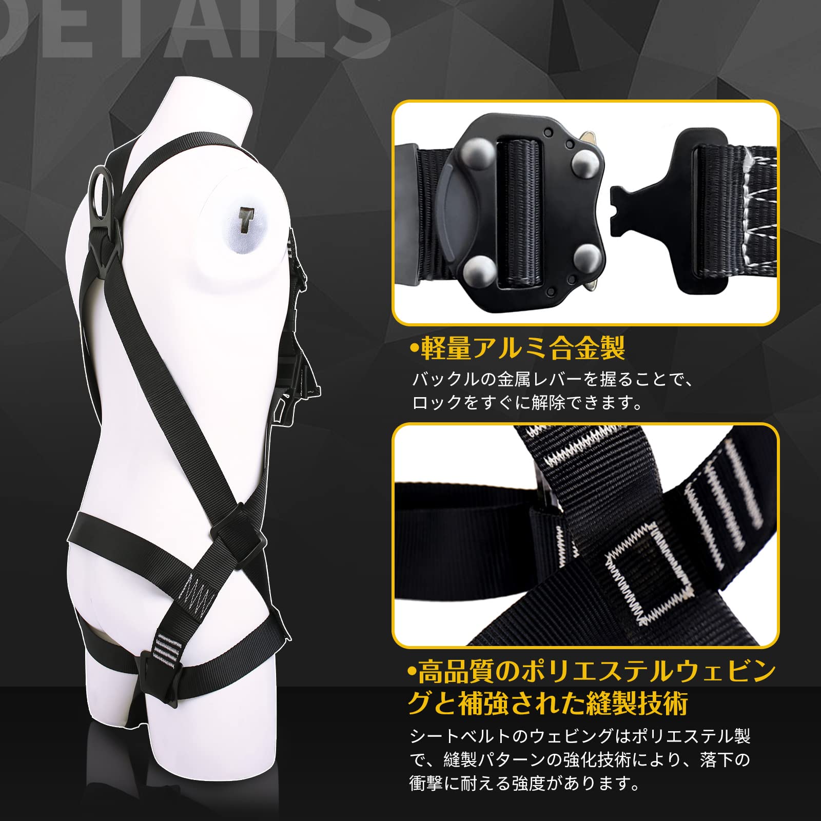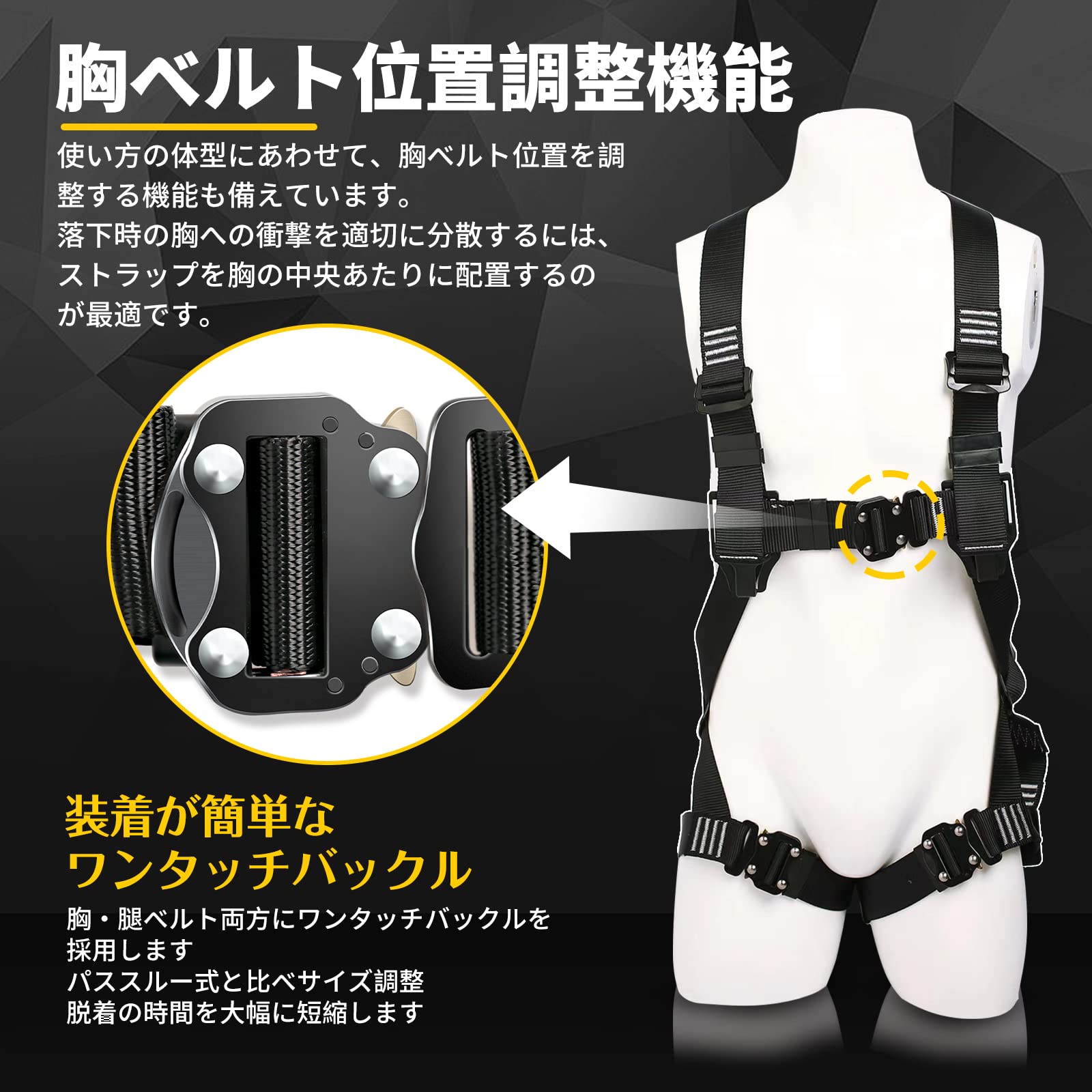 【ワンタッチバックル 脱着簡単 負担軽減】:安全帯 フルハーネスは調整可能で脱着簡単です。装着時間を大幅に短縮します。腹部と胸と脚のサイズは調整できる、あらゆる形の人々に適しています。腹部と胸と脚ワンタッチバックル、シートベルトをすばやく着用して取り外し、利便性を高めます。ワンタッチで一度ロックすると、解除しない限り、頑強にガッチリロックします。