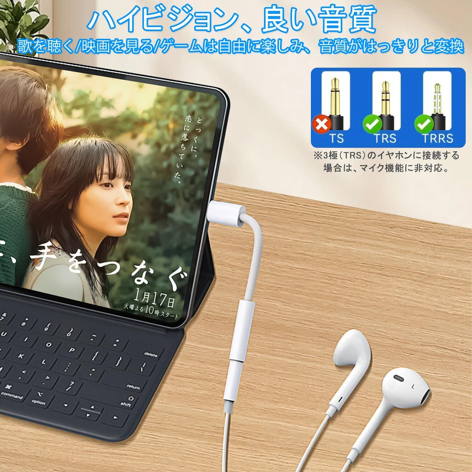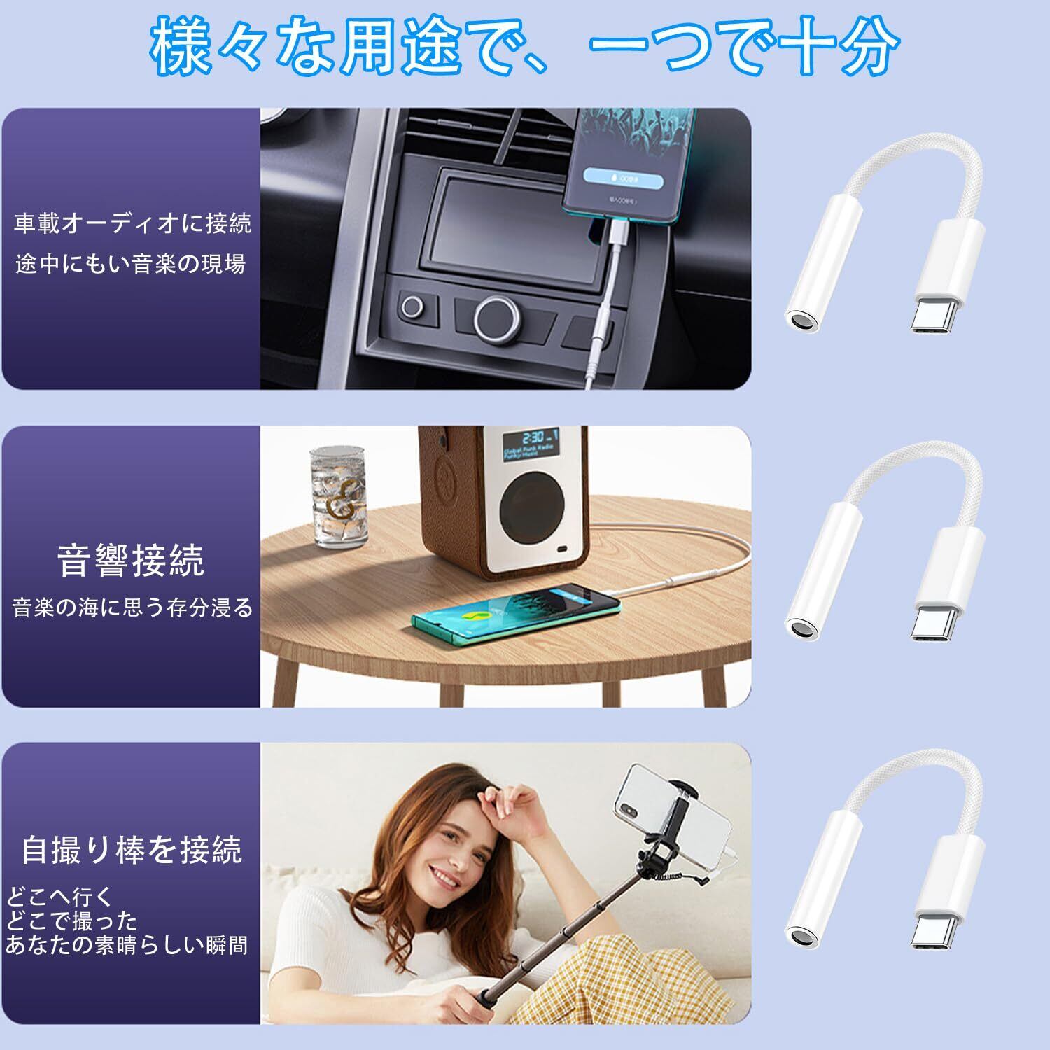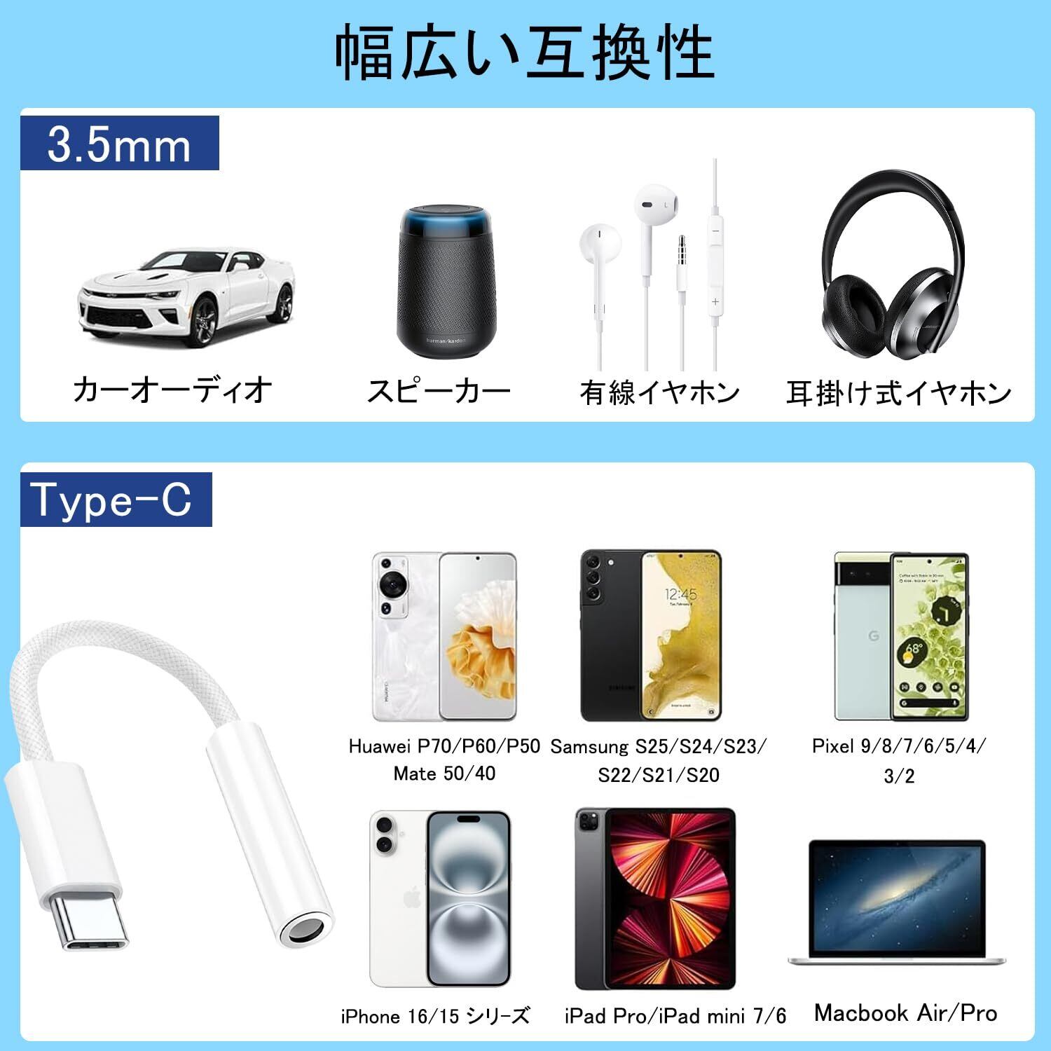 【対応機器】このType C-3.5mm 変換アダプタはType Cポートがを備えるデバイスに対応できます。MAC OS、I OS、Androidのシステムに対応で、幅広い互換性が持ちます。■USB Type-Cポート搭載機器:iPhone 16、iPhone 16 Plus、iPhone 16 Pro、iPhone 16 Pro Max、Phone 15、15 Pro、15 Pro Max、15 Plus、 / iPad / Mac / Androidスマートフォン / Androidタブレット / パソコン ■3.5mm(3極または4極)ステレオミニプラグ搭載機器: イヤホン / ヘッドホン / ヘッドセット(X-BOX等USB-Cポートからの音声出力に対応しない機種では、本製品を利用できませんのでご注意ください。)