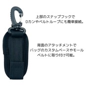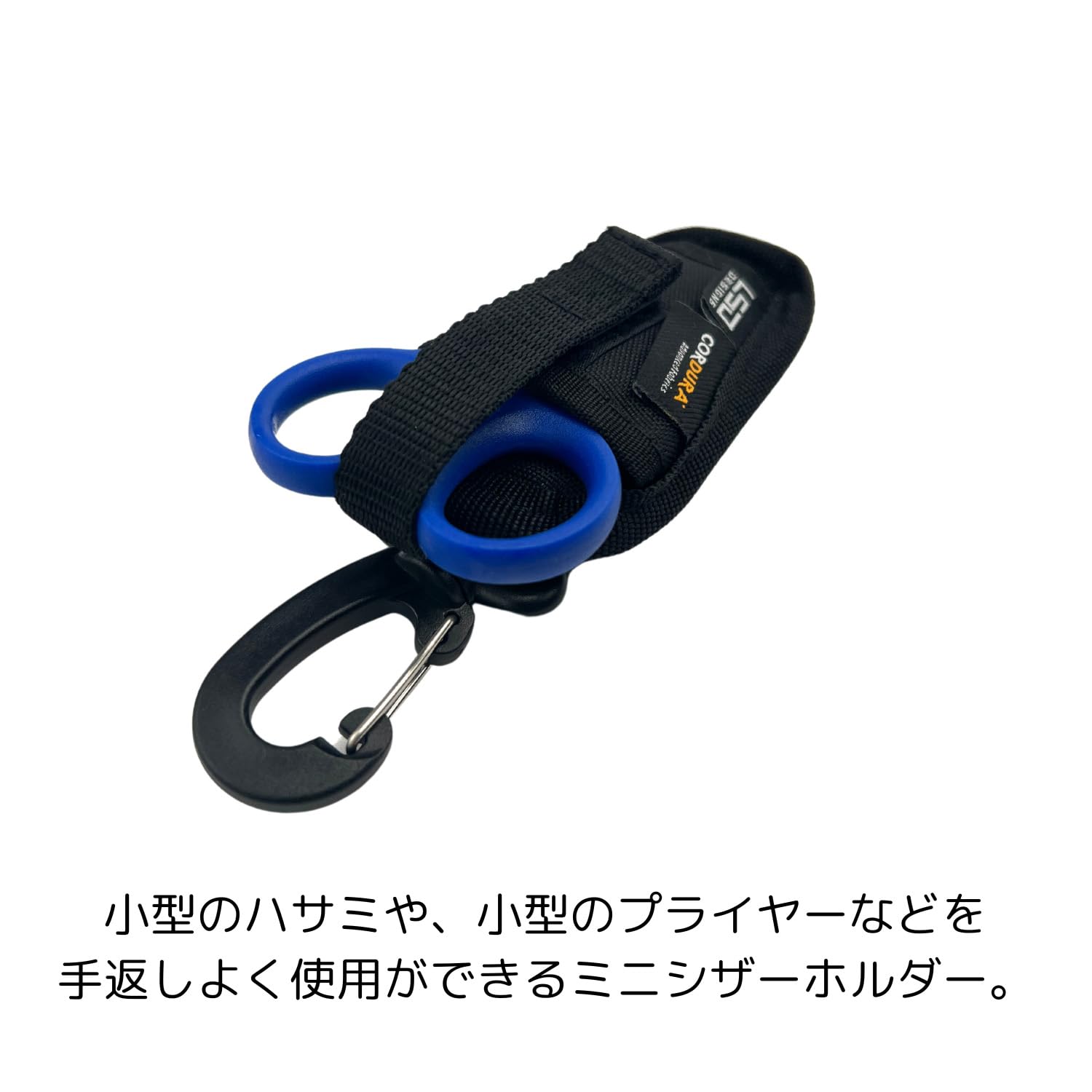 小型のハサミや、小型のプライヤーなどを手返しよく使用ができるミニシザーホルダー。コーデュラ素材で耐久性を増し、バッグの側面や、ライフジャケットのベルトなどに装着できます。上部のスナップフックでDカンやベルトループにも簡単接続。