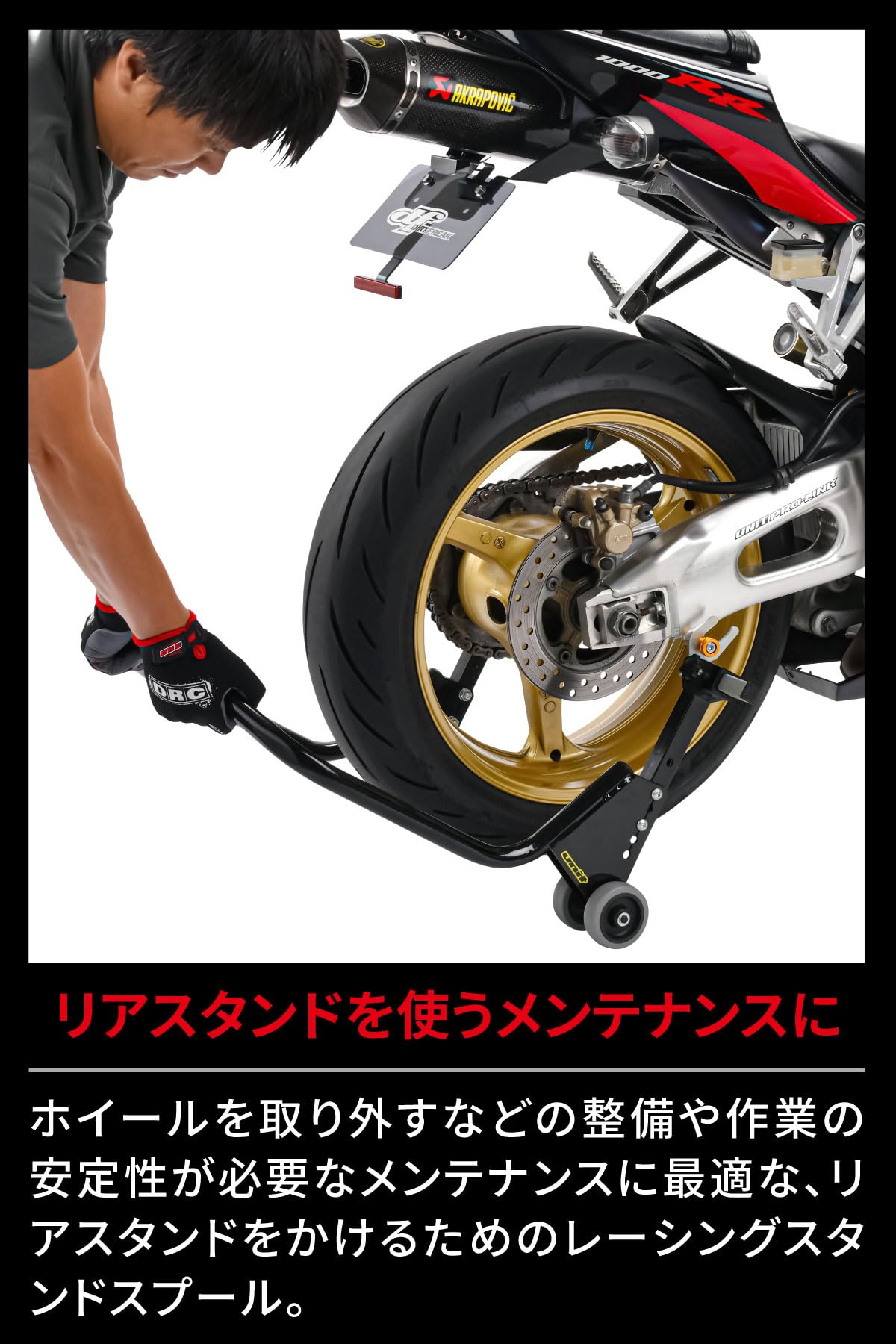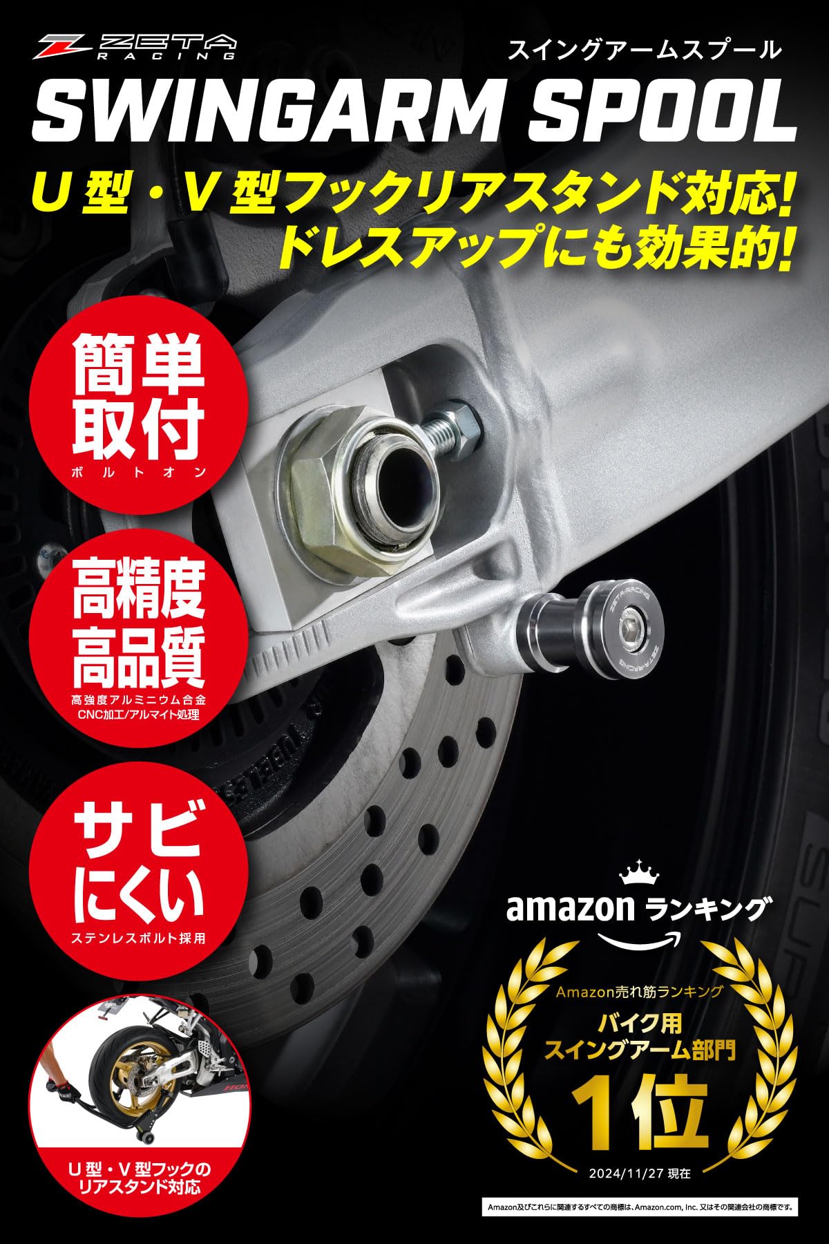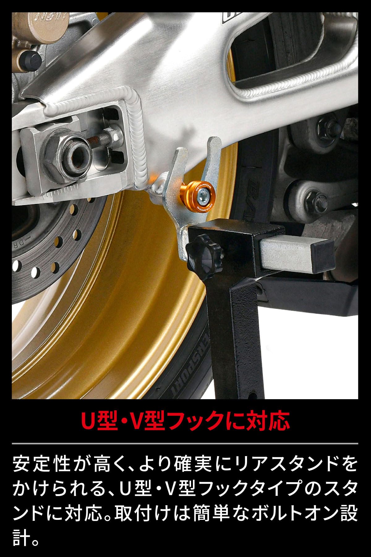 UまたはV受けタイプのリヤスタンドに対応するレーシングスタンドフック。