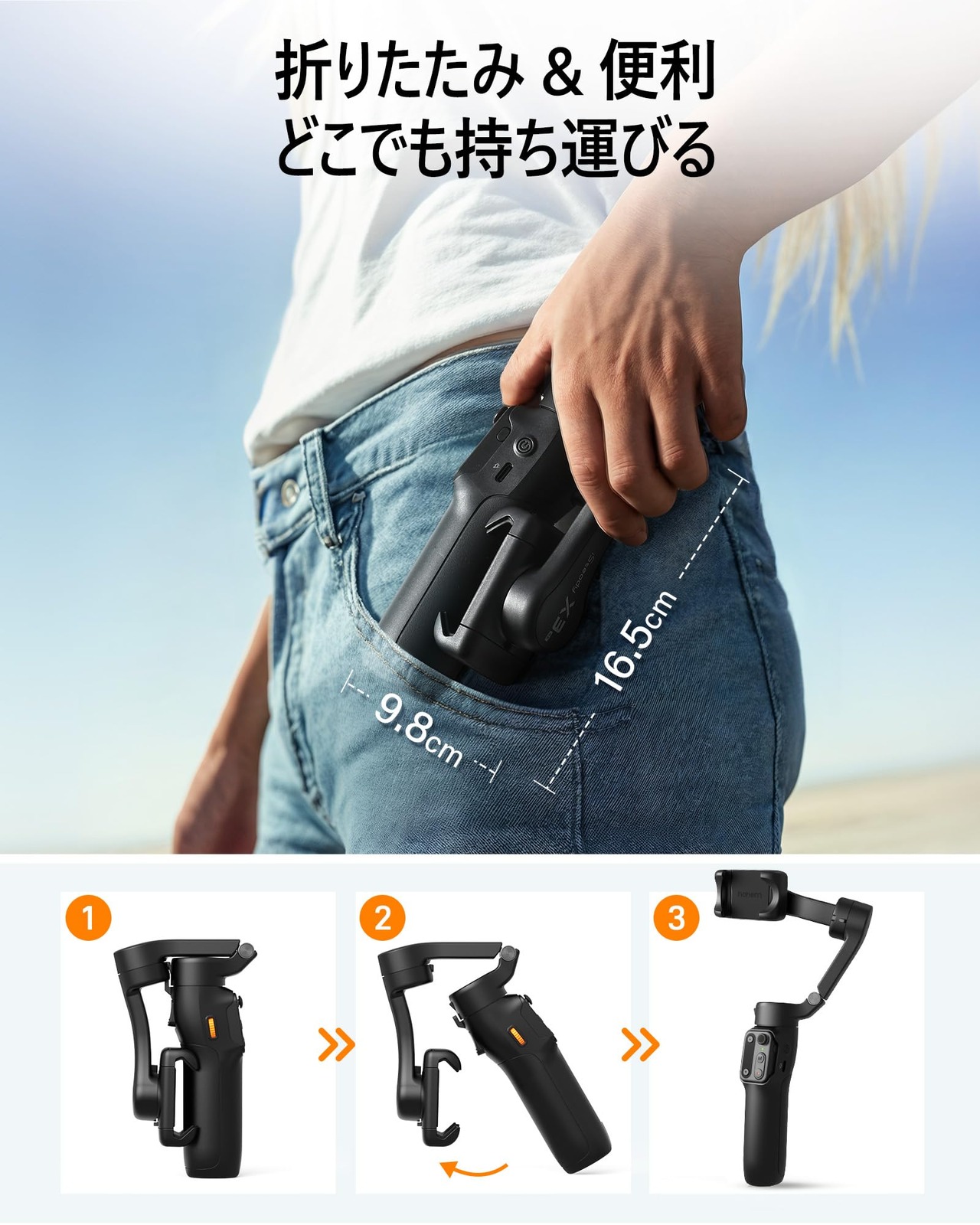 【小型軽量&三脚】hohem X3 SE スマホジンバル本体は約360gで、98×44×160.5mmの折りたたんだのサイズで、場所取らず収納しできます。ポケットやカバンに入れ、どこへでも気軽に持ち歩けます。外部三脚が付けていますので、机上面にジンバルを置き、リモコンを取り外すと、長距離リモート撮影が行えます。