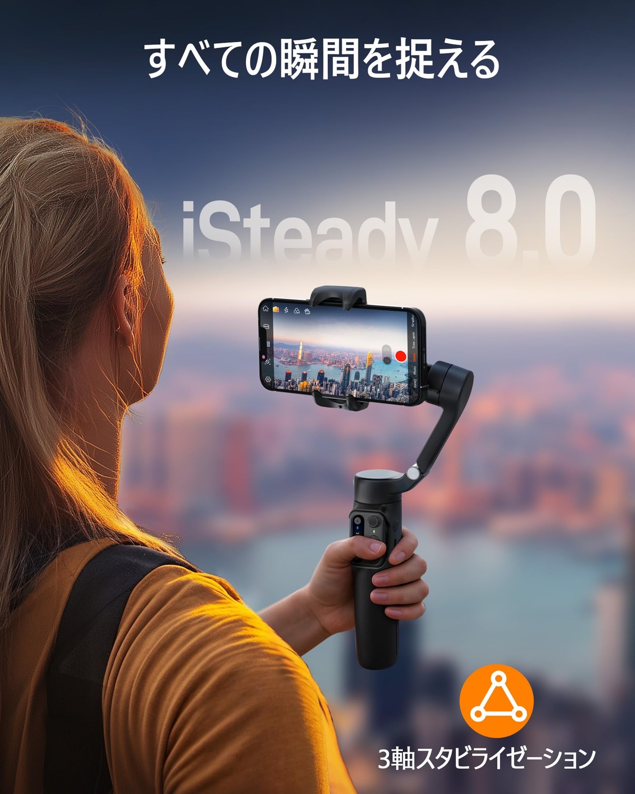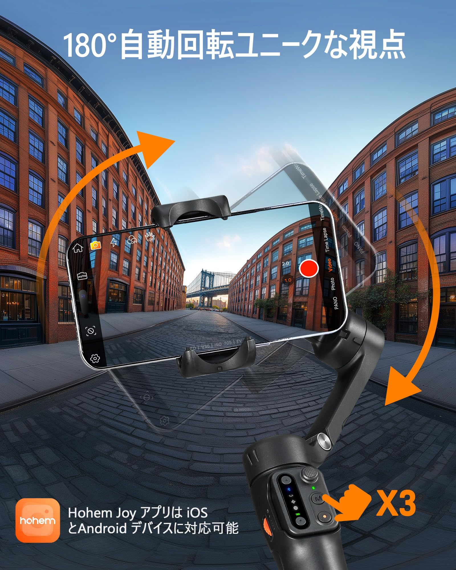 【hohem 8.0の3軸手ぶれ補正 】hohem X3 SEには、アップグレードされた3軸手ぶれ補正機能 hohem 8.0 を搭載しています。hohem 8.0では手ぶれ補正アルゴリズムが適化され、前代未聞の手ぶれ補正効果を実現しています。直交構造がアップグレードされたため、広角撮影でもロール軸がレンズ内をはいる心配する必要がなく、安心して安定した映像を撮影することができます。スマホのブレを抑え、高品質で鮮明な動画や画像を簡単に撮影できます。