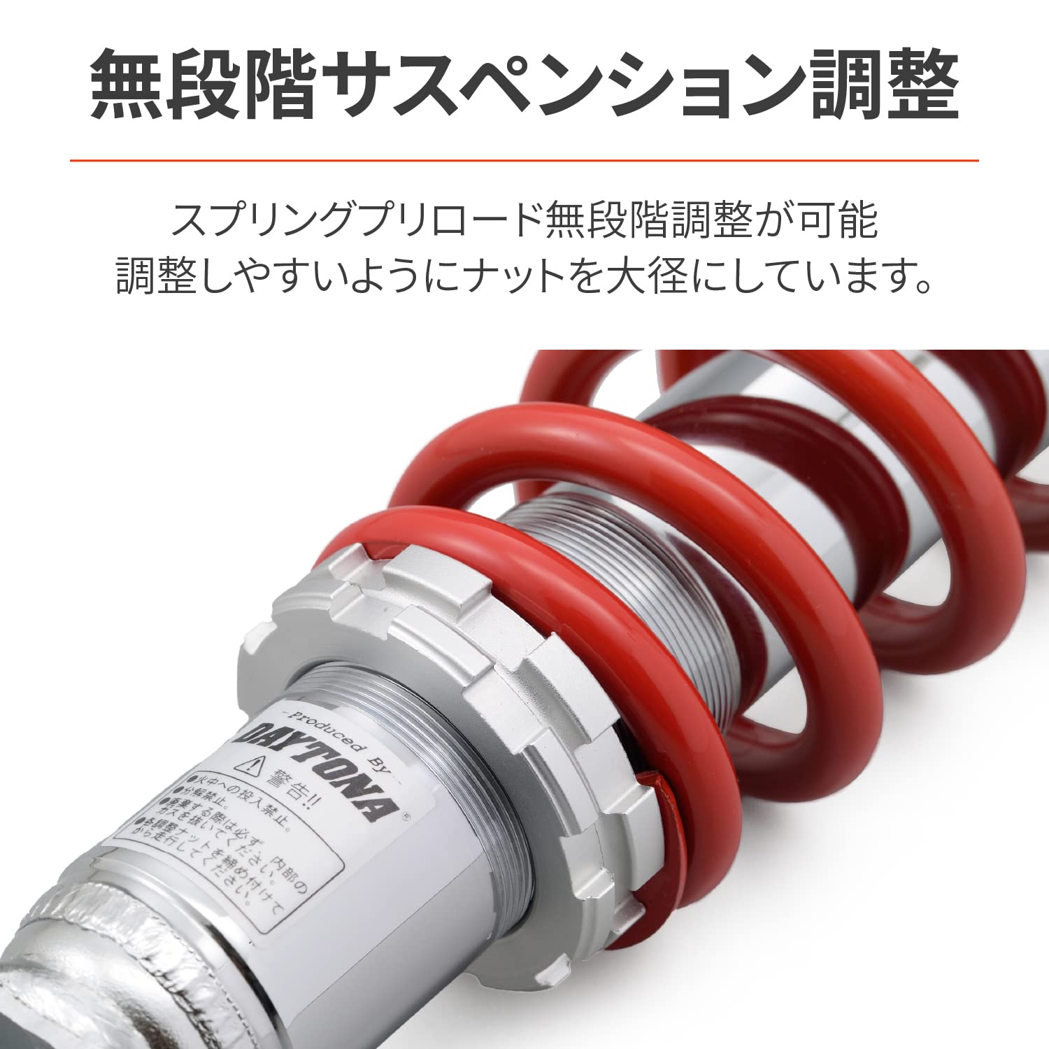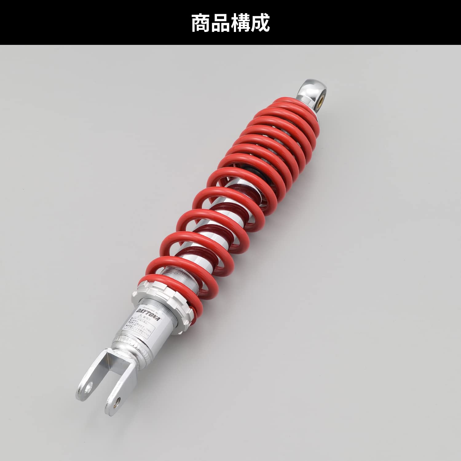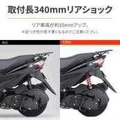 リア車高約15mmアップで、深いバンク角と高い旋回性を実現。クロームメッキボディで引き締まった足回りを演出します。オイルダンパータイプで、スプリングプリロードは無段階調整が可能です。調整がしやすいように大径の調整ナットを採用しています。ボディはクロームメッキ仕上げ、スプリング色はレッド。取付長340mm。【対応車種】アドレスV125(05-13)[K5/6/7/9、L3、L0/1/3]※ 全長が純正より長いためシート高が上がり、足付き性が若干悪くなりますのでご注意ください。