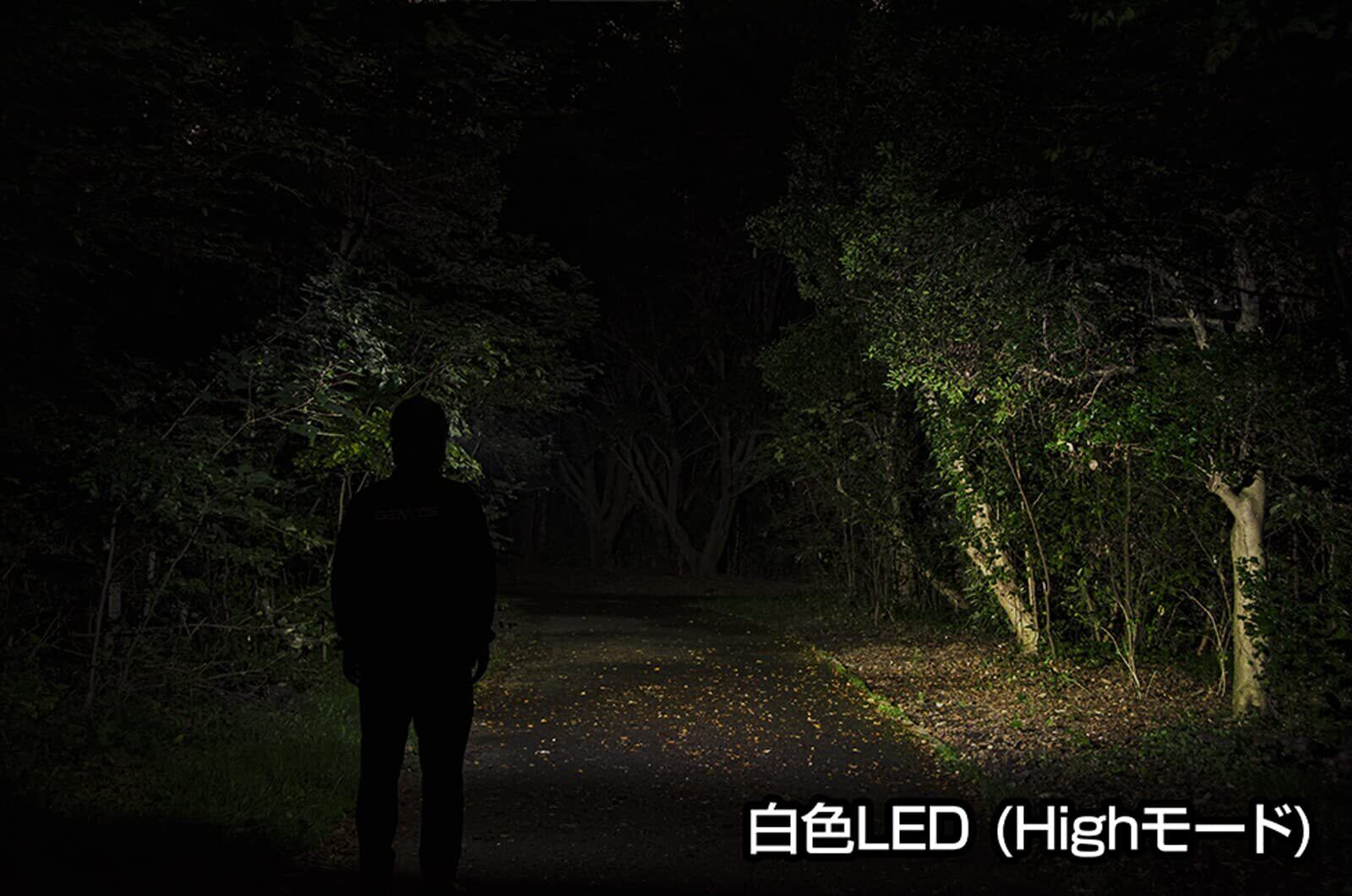 明るさ:High/300ルーメン・Mid/100ルーメン・Eco/30ルーメン、サブ暖色LED/6ルーメン、使用電池:単4形アルカリ電池×2本