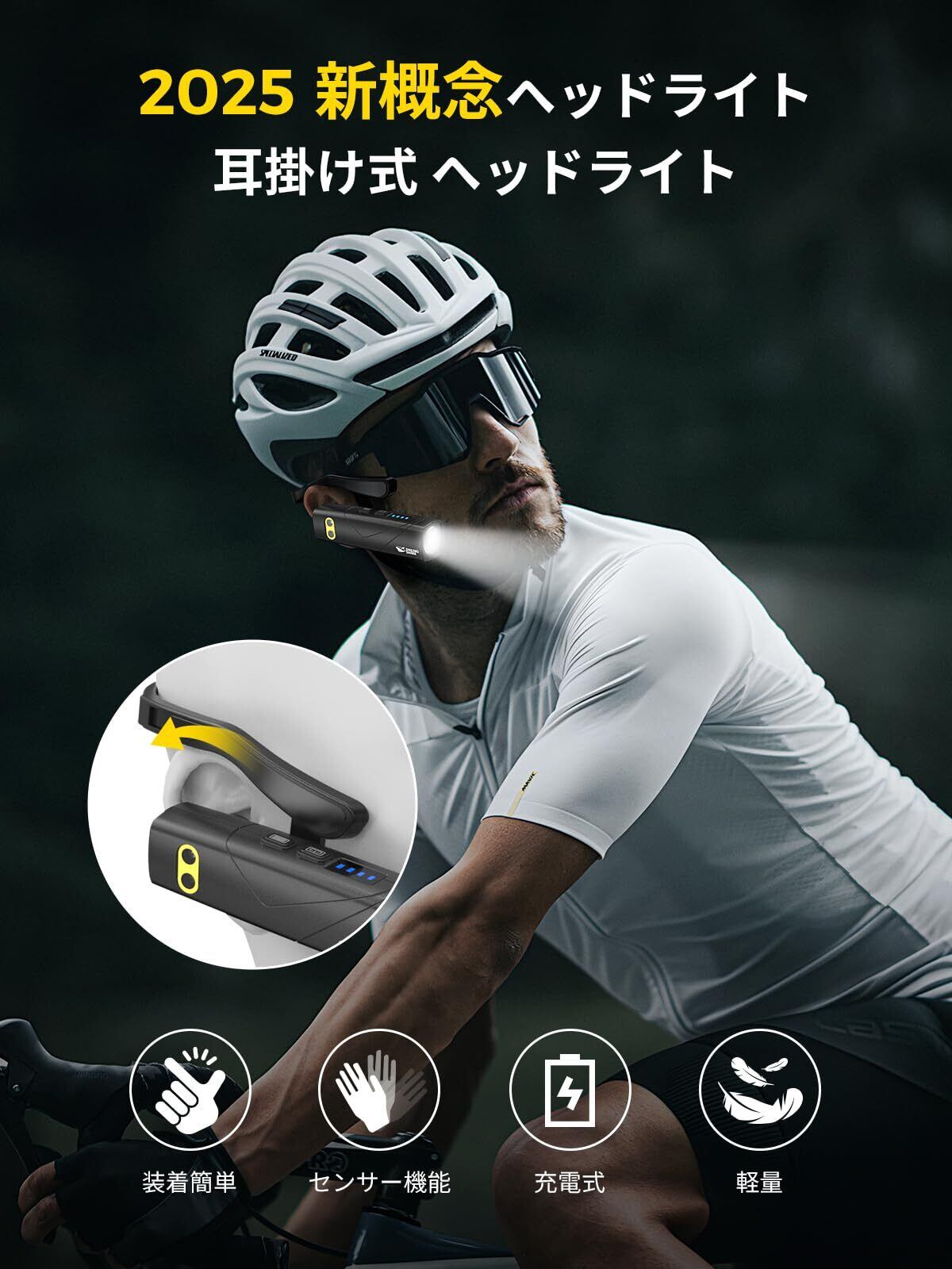 【業界始の耳装着式デザイン】新しい概念「耳掛け式ヘッドライト」を提案します。耳にかけることだけで、ヘッドライトを使用できます。超軽量で耳に負担がかかりません。便利で美観なデザインにより、どんな活動にも適しています。