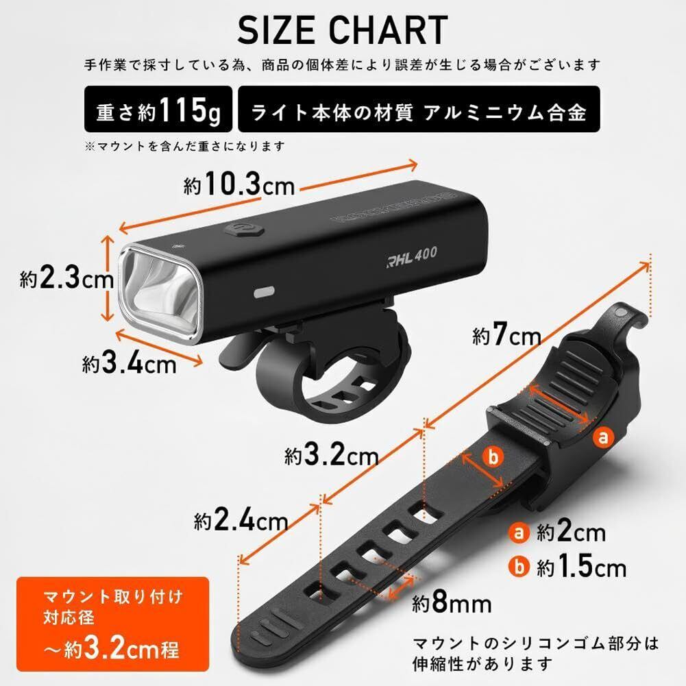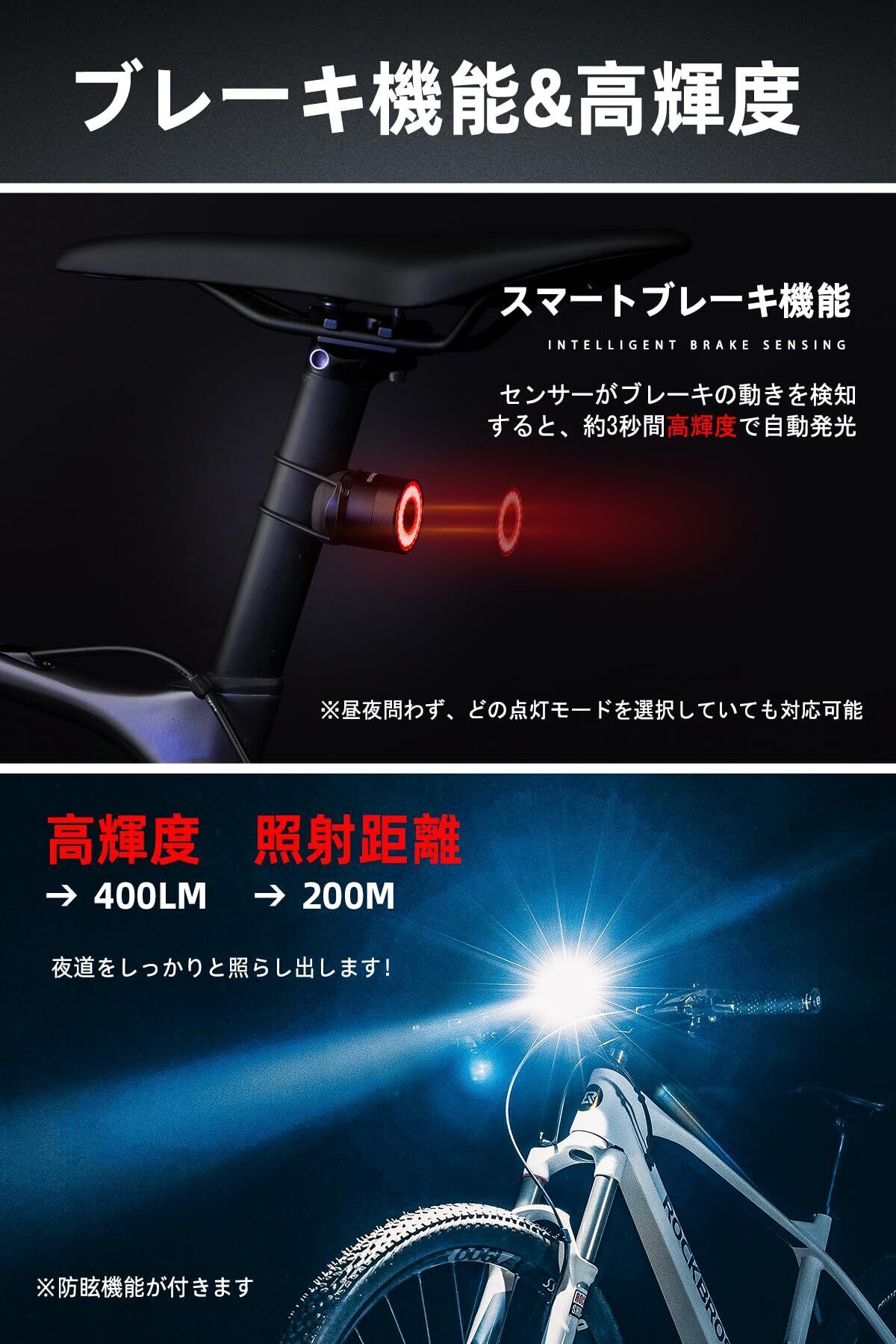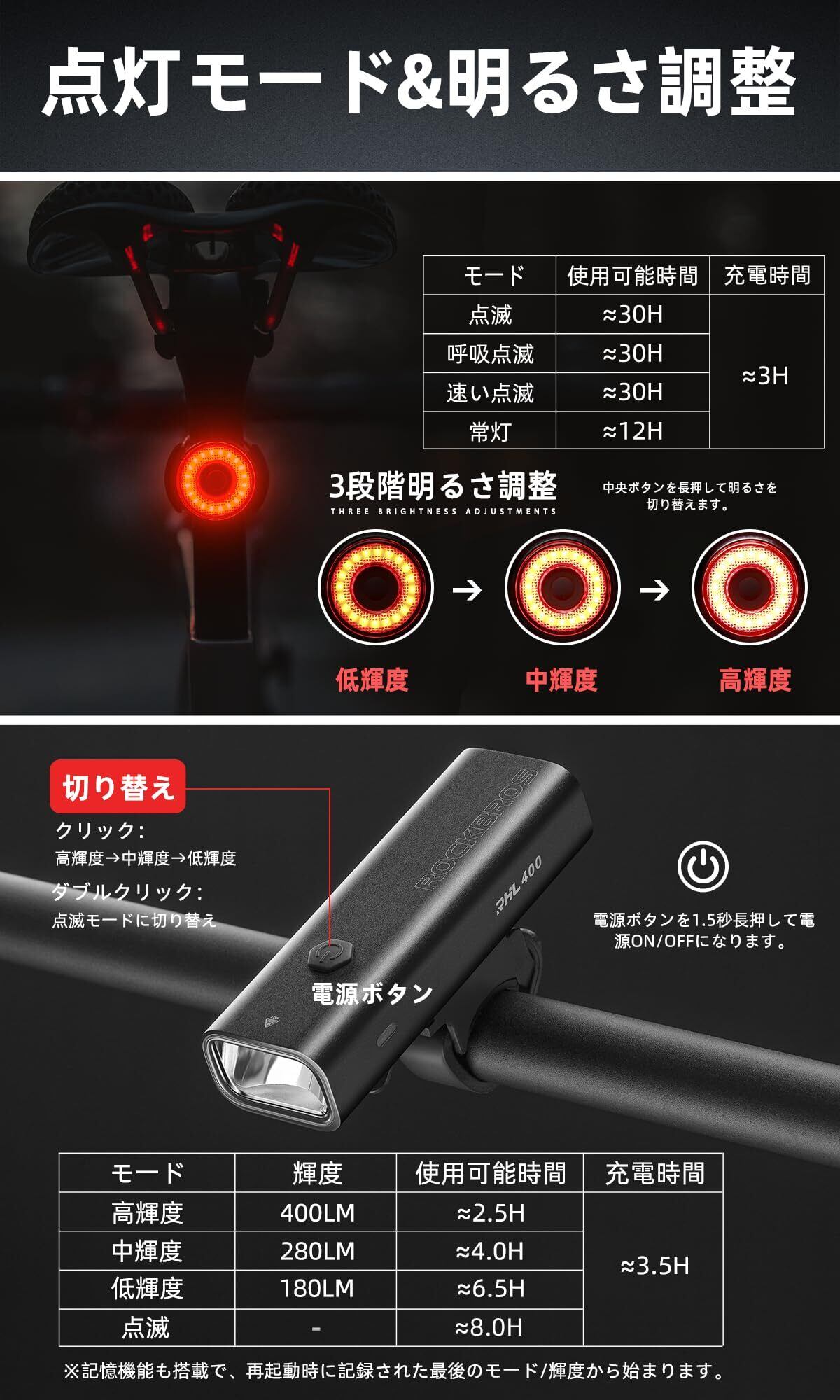 【4点灯モード&明るさ調整】❶テールライト:4種類の点灯モードを搭載しているので、環境や状況に合わせて選べます。点灯モードは中央ボタンの短押しで、点滅(約30時間)→呼吸点滅(約30時間)→速い点滅(約30時間)→常灯(約12時間)に切り替えができます。ライトの明るさ調整は3段階で、中央ボタンを長押して低輝度/中輝度/高輝度に切り替えます。 ❷ヘッドライト:電源ボタンを1.5秒長押して電源ON/OFFになります。点灯モードは4種類!電源ボタンを短押し、高輝度(400ルーメン)→中輝度(280ルーメン)→低輝度(180ルーメン)に切り替えます。電源ボタンをダブルクリックして、点滅モードになります。様々なシーンで使い分けてご使用いただけますよ。使用可能な時間:高輝度(約2.5時間)、中輝度(約4時間)、低輝度(約6.5時間)、点滅(約8時間) 点灯モードは記憶機能も搭載で、次の電源ON時にも設定する手間がかからなく、記録された最後のモード/輝度から始まります。