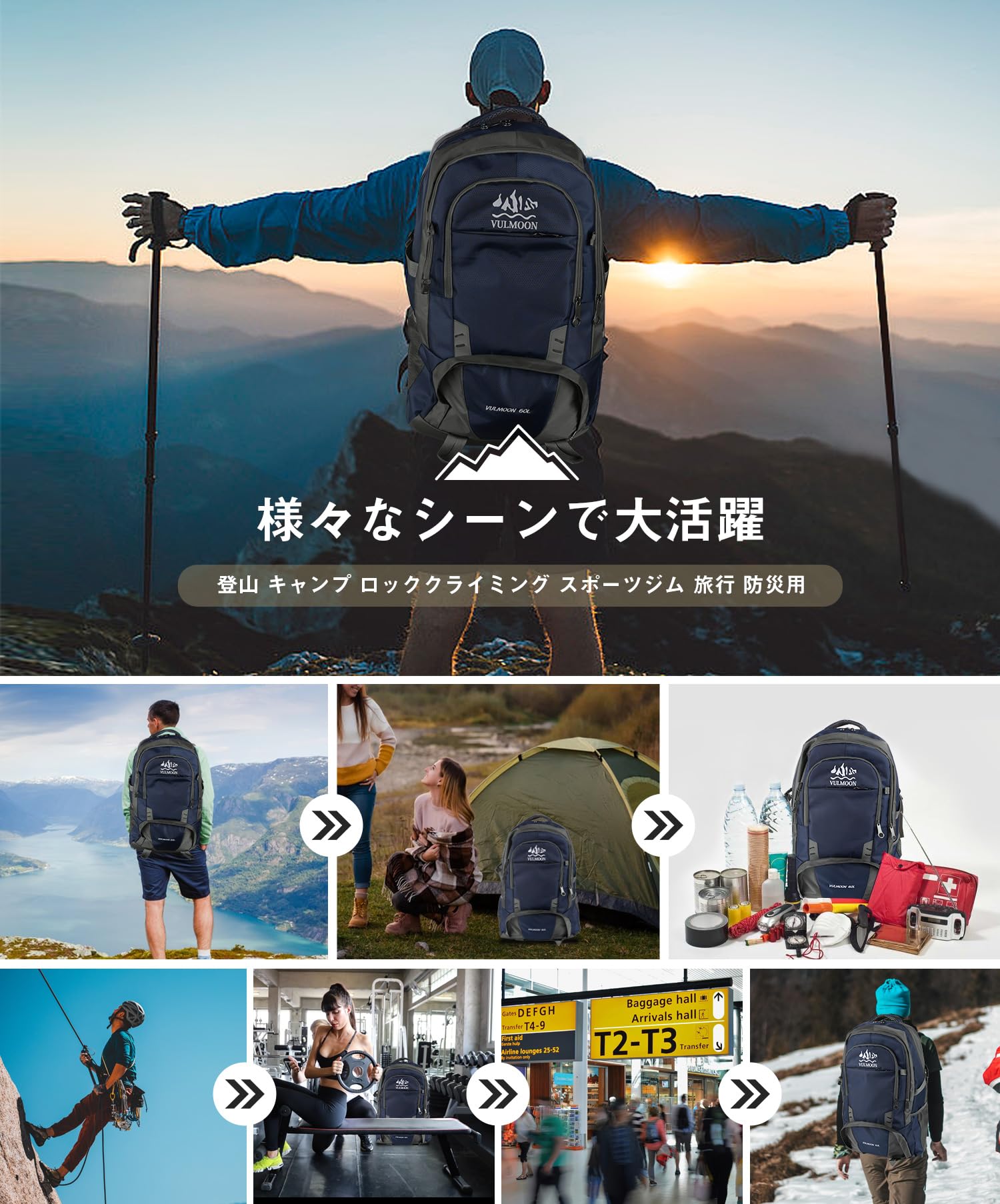 [Vulmoon] リュック 大容量 メンズ 60L 登山 カジュアル バックパック 防水 軽量 防災リュック アウトドア リュックサック おしゃれ 出張 通勤 海外 旅行 キャンプ用品 スポーツジム