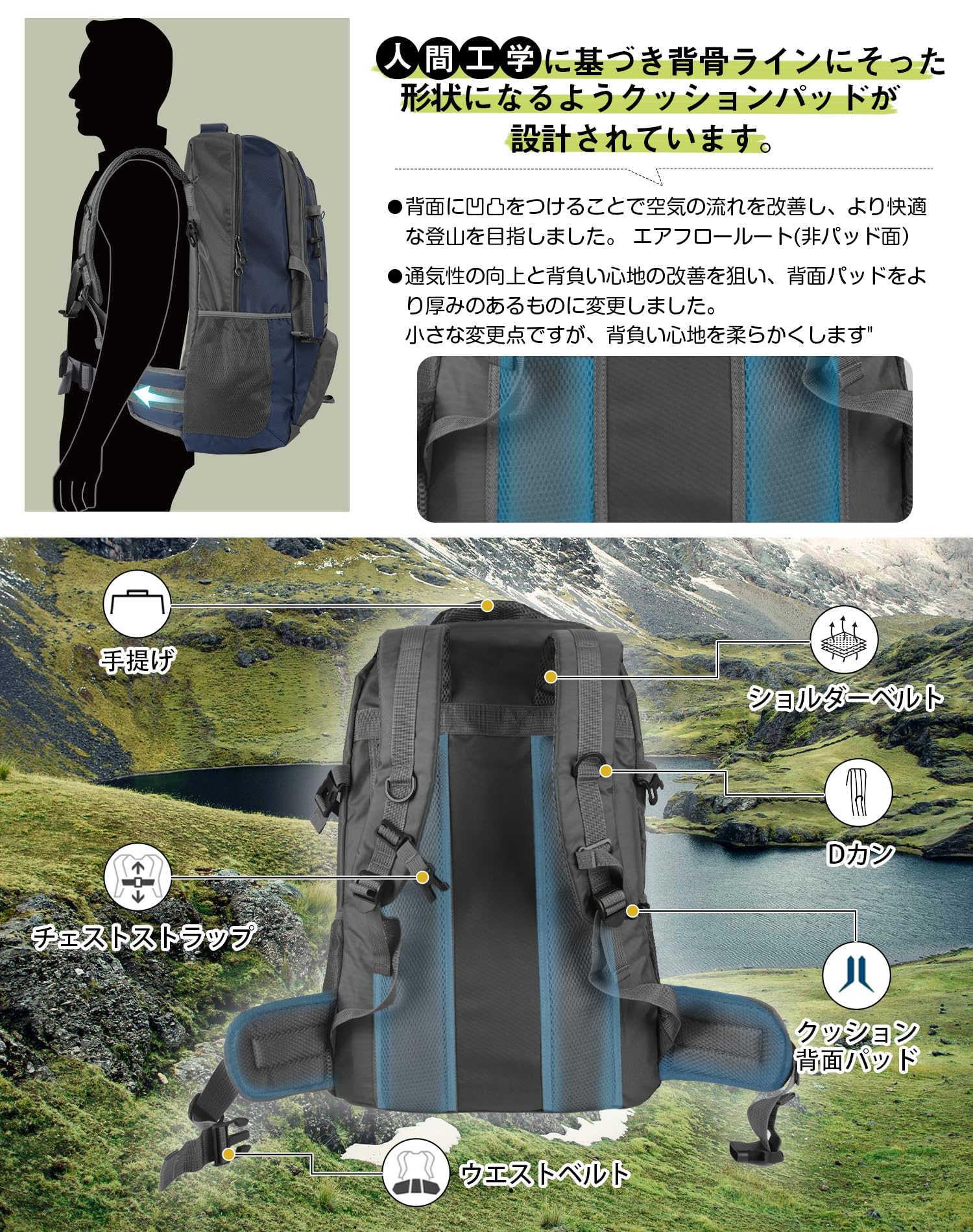 ・クッション入りのショルダーベルトは、肩に負担がかかりにくく 長時間背負っても疲れない。裏面(体に接する面)はメッシュ素材で暑い時期でも蒸れずに快適。体にフィットするのに通気性も抜群クッション入り背面パッド,背面パッドはクッション入りで背中にぴったりフィット。中央部分は凹凸があり、縦には空気が通るので、背中に汗をかいても蒸れにくい。背面との一体感と汗処理能力、クッション性と長時間行動での疲れにくさといった実用レベルでの真の快適さで定評のあるさらにパック本体をより身体に近づけられるようにボディフィットストラップが改良されました。これによって荷物の量にかかわらずより重心を身体に引き寄せることができ、安定性と疲れにくさがさらに向上しました。