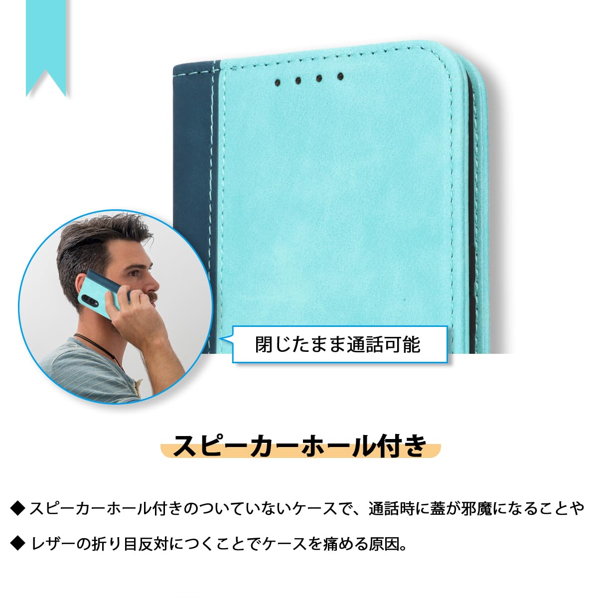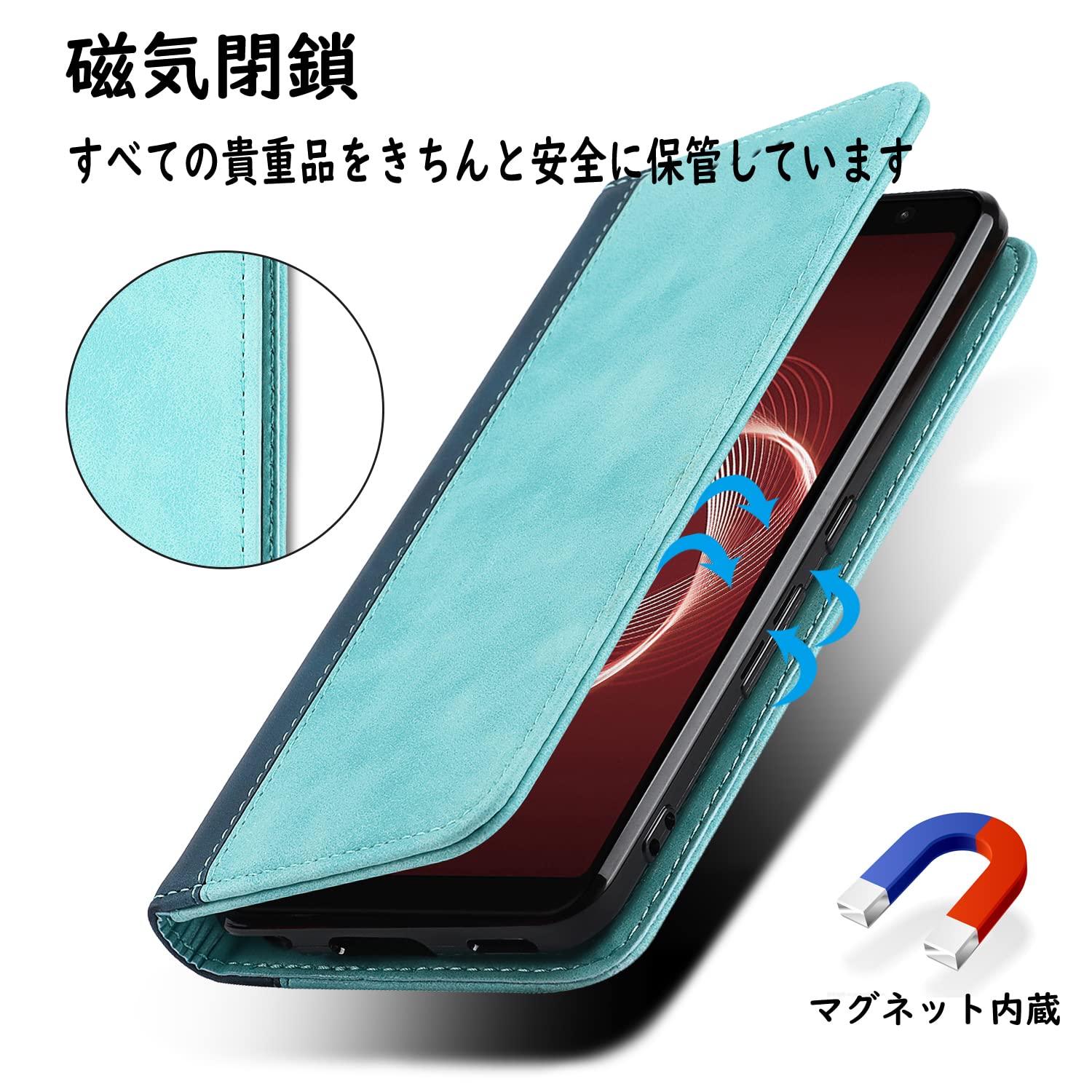 【マグネット式】内蔵マグネットの手帳型ケースです。カバーに使われているマグネット式の設計により、スマートフォンをしっかり固定できます。閉じたときにも電話の音は聞こえるので、持ち運びも簡単で使い勝手がよいです。お年寄りやお友達へのプレゼントにも最適です。