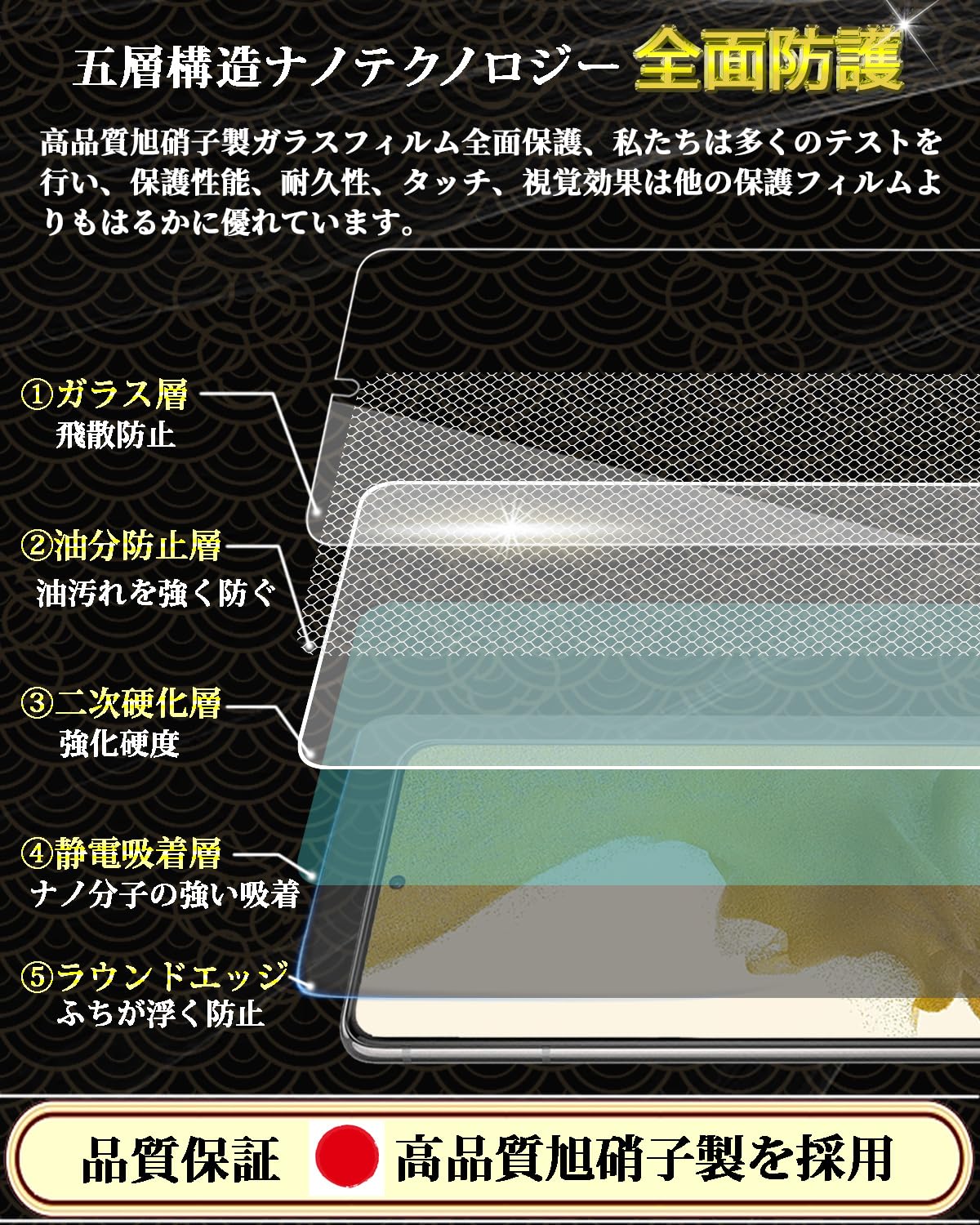 特徴 9H表面硬度,飛散防止,防指紋,撥油コーティング,撥水剤,耐衝撃性,ラウンドエッジ,気泡なし,高透過率,簡単貼り付け