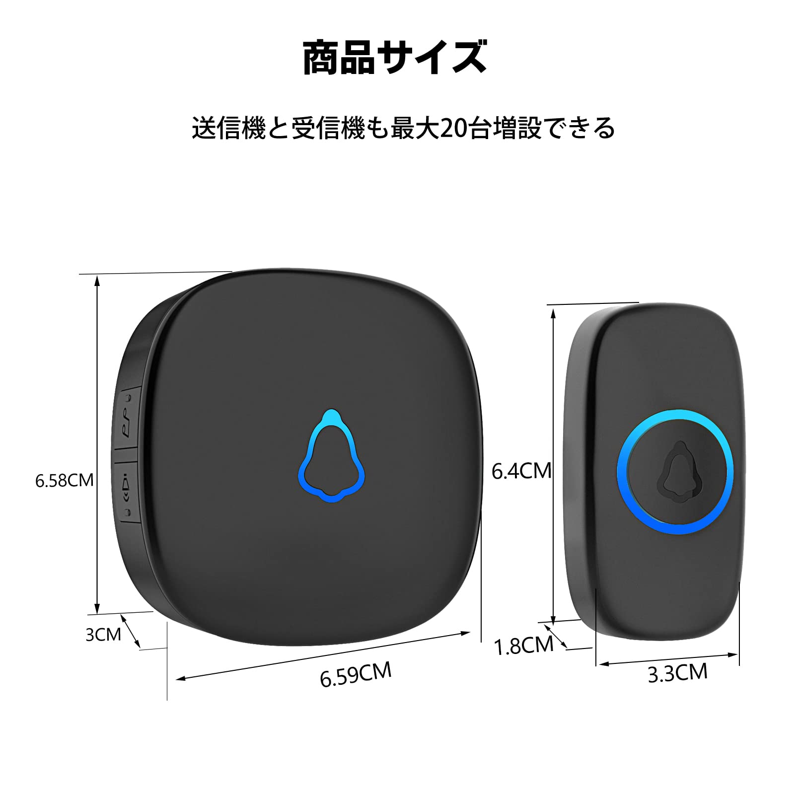 【耐候性 & 省エネルギー】ドアベルは高品質のABS素材製で、耐火性と難燃性に優れています。動作温度:-20〜60°C(4〜140 °F)。IP55の防塵・防水性能。受信機には最適化した回路設計を採用。送信機はボタンを押さない限り電力を消費しません。電池寿命:3年間。