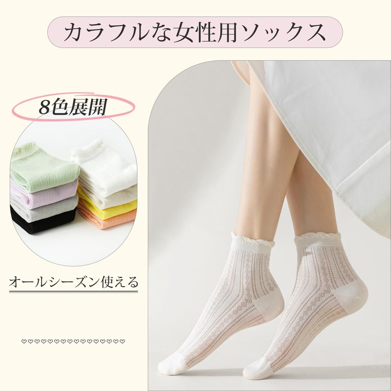 【yazon靴下レディースくるぶし仕様】:主素材:70%綿 サイズ:フリーサイズ約22-24.5cm。 生地:薄め パーケージ:8足セット(パープル、ベージュ、ピンク、グレー、緑、黒、白、カーキー鮮やか8色)〇〇靴下レディースソックスはリブを細かく編んだデザインが採用されています。柄は細かくで丈夫で、感触はとても良く、女性の可愛さとエレガントを感じできます。人々の中にファションで人気なメッシュ靴下です!使い捨て靴下として旅行や出張利用してむだ遣感じない、適当な耐久性があり、日常用繰り返してもコスパ良いレディースくるぶしソックス。