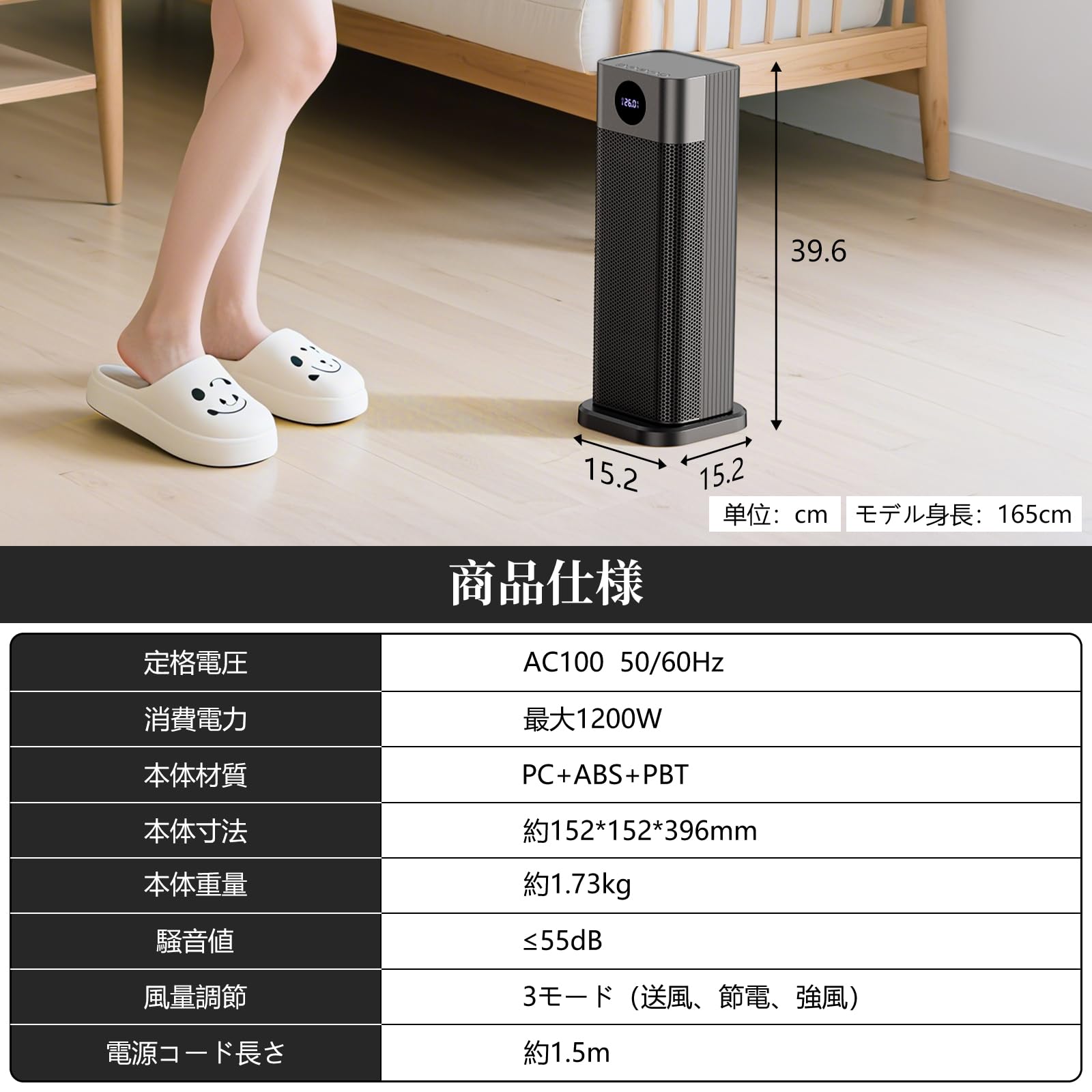 【商品仕様と安全なご使用について】コンパクトサイズながら最大1200Wの暖房力を発揮。静音設計(55dB以下)でリビングや寝室でも快適にご利用いただけます。1.5mの電源コードとPSE認証済みの安全設計で、家中どこでも安心してお使いください。ご使用前には必ず取扱説明書をご確認いただき、転倒時や高温部への接触にご注意ください。(※定格電圧:AC100V 50/60Hz 本体材質:PC+ABS+PBT)