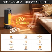 【寒い冬に心強い速暖ファンヒーター】わずか2秒で温風がスタートする驚異の速暖性能を実現。70度の広範囲に及ぶ左右自動首振り機能で、部屋の隅々までムラなく暖めます。軽量コンパクト設計(約1.73kg)で持ち運びも簡単。リビングや寝室はもちろん、トイレや脱衣所など家中の寒いスポットで大活躍するマルチな暖房器具です。暖房効率を最大限に高める独自の風路設計が特徴です。
