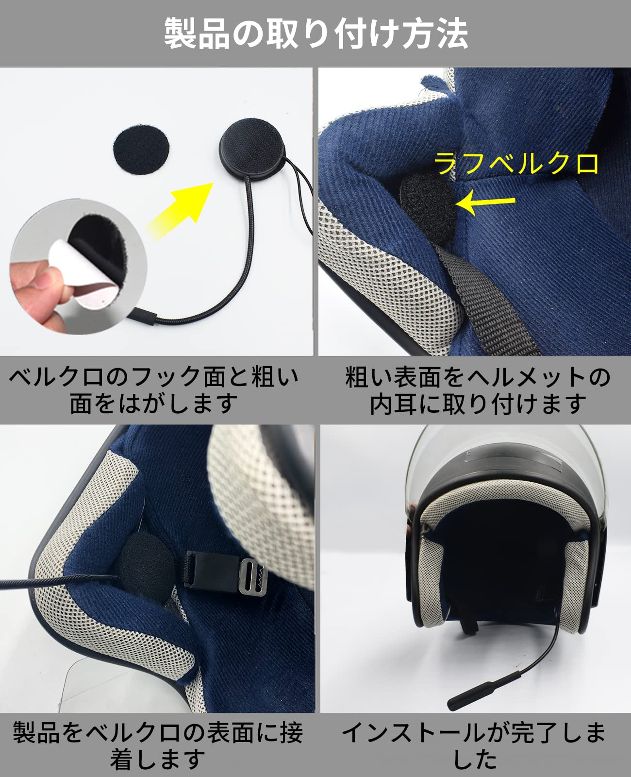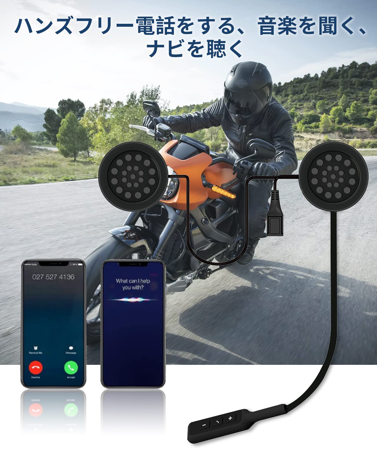 【音声制御&大音量&パッケージ内容】携帯電話をインカムに接続し、ハンズフリーで、スマートフォンを触らずに、話しながら走行できる。音の大きさは別のバイクインカムより大きく高速でも聞こえます。オートバイヘルメット イヤホン本体 *1、充電ケーブル*1、日本語マニュアル* 1、マジックテープ*4。