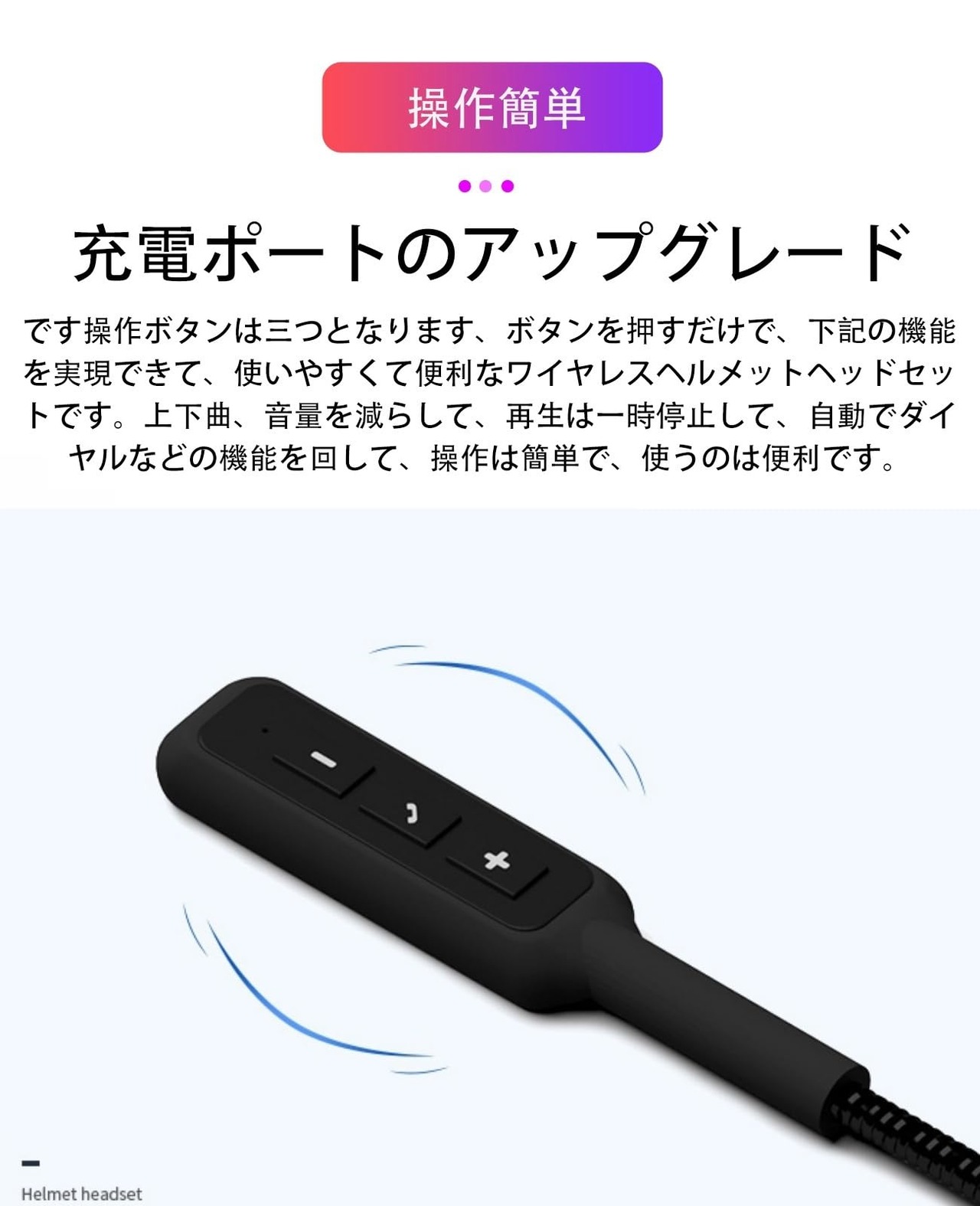【クリアな音質&操作簡単】バイクインカムイヤホンは音量も良く出て、なおかつ音割れすることなく明瞭さが保たれていて。新しい指向性サウンド伝送技術を使用し、対面と同じくらいクリアな音質の通話とプライバシー保護を実現します。プロの音響が音を調整し、密度感と弾力性に優れたハイファイ音質で、臨場感あふれるダイナミックな音楽をお楽しみいただけます。ボタンが3個だけでボタンが大きいから操作しやすい。一時停止、スキップ、オンオフ、電話応答などをすべてボタンで操作可能です。