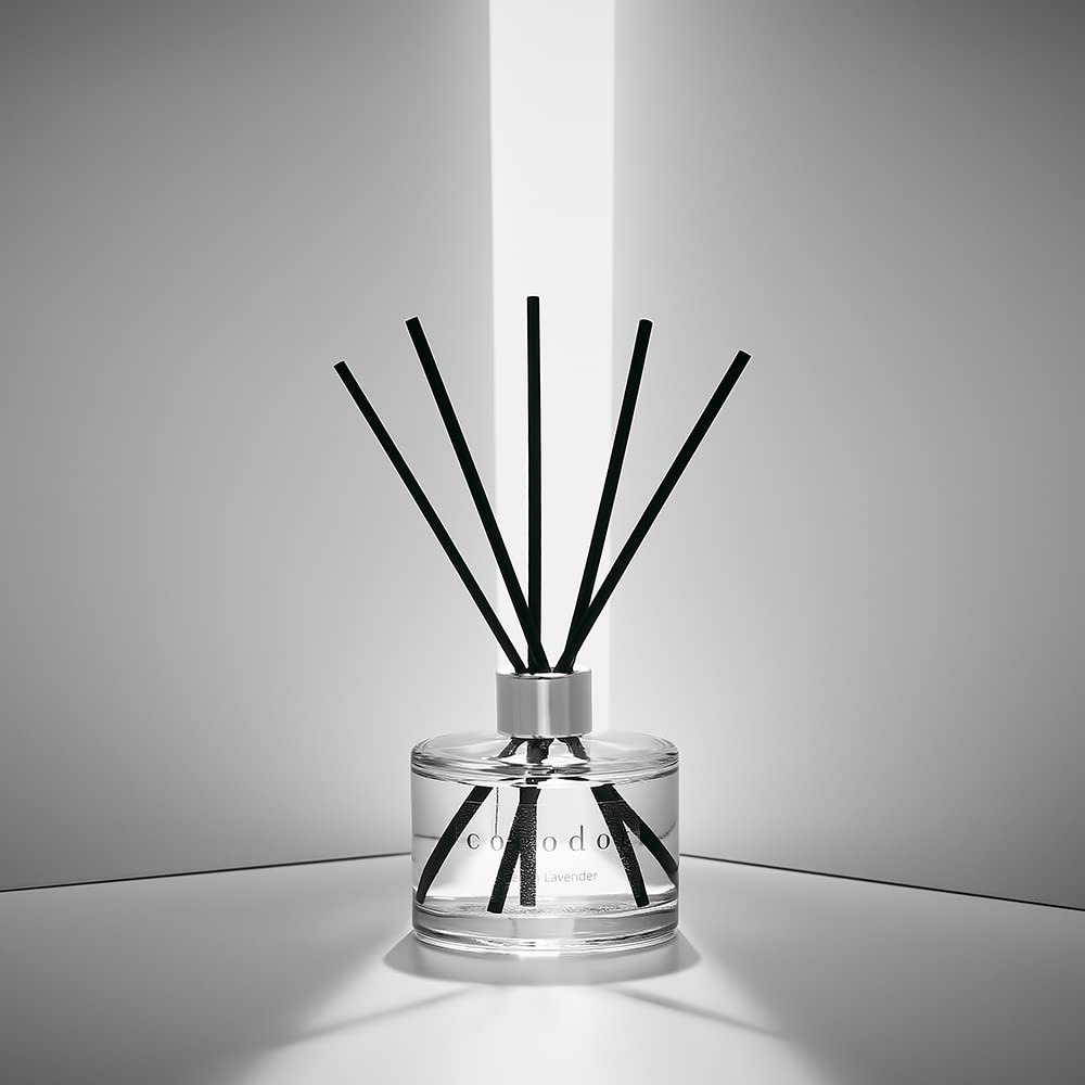 【リードディフューザーセット】高品質アロマオイル50mlに、透明なCocod'orシグネチャーガラスボトルとブラックファイバースティック5本を添えた芳香剤。香りで満たしつつ、洗練されたインテリアとしても美しく映えます。