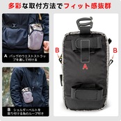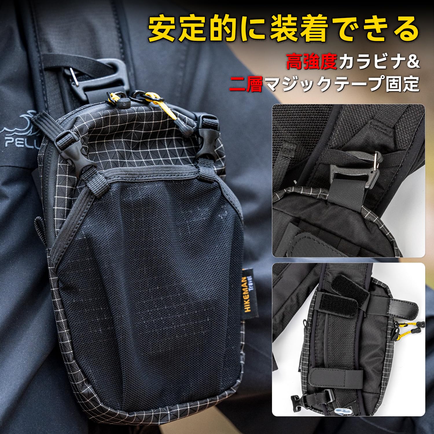 「ズレしなく、簡単に装着」:カラビナ付き、そして二重のマジックテープで、リュックに左右の揺れを抑えつつ、しっかり取り付けができます。ポーチにはダブルジッパーを使用、登山アプリ使用や撮影したい時はすぐスマホを素早く取り出せるのも助かります。