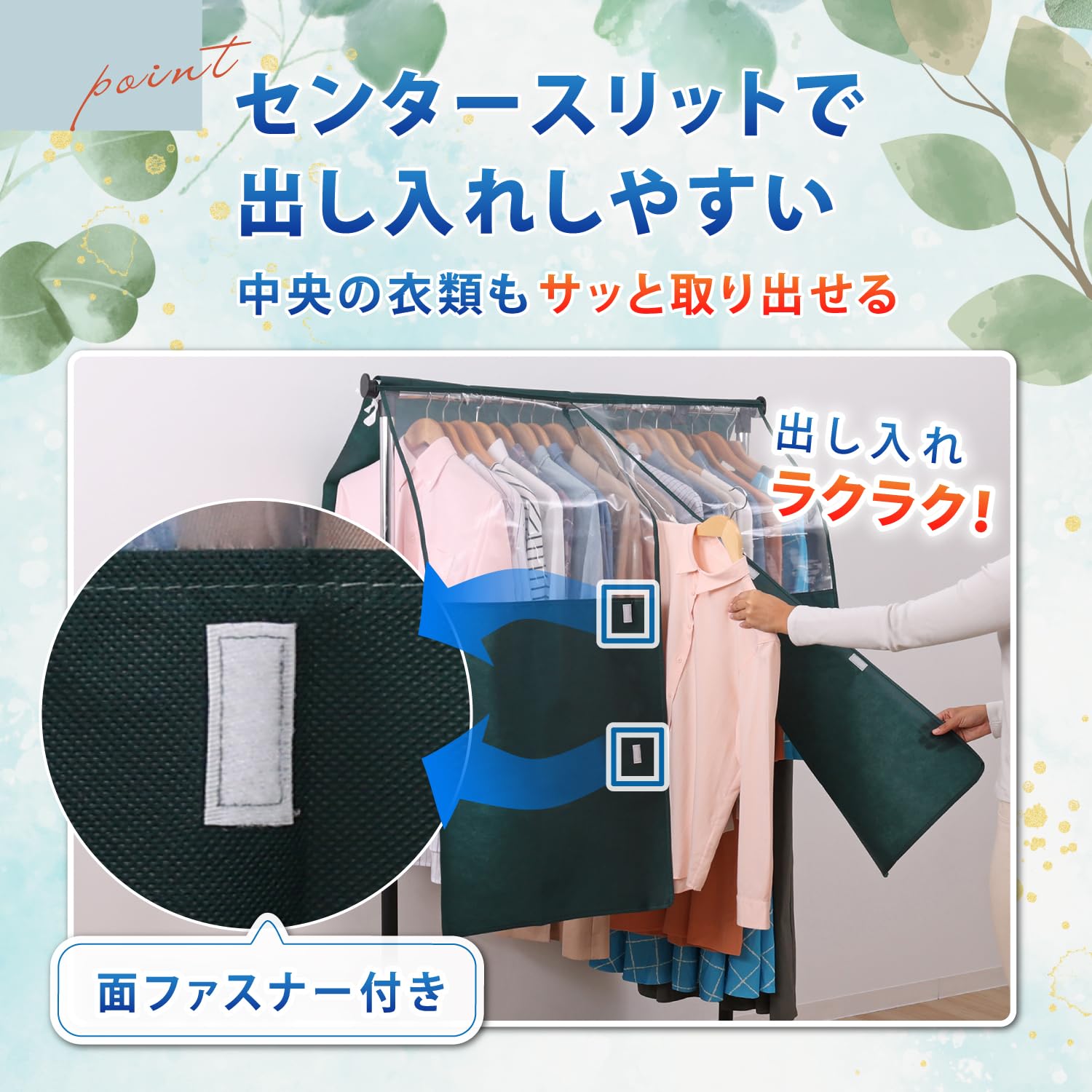 【便利なセンタースリット】:手前の面ファスナー付きのセンタースリットで、衣類の出し入れラクラク。