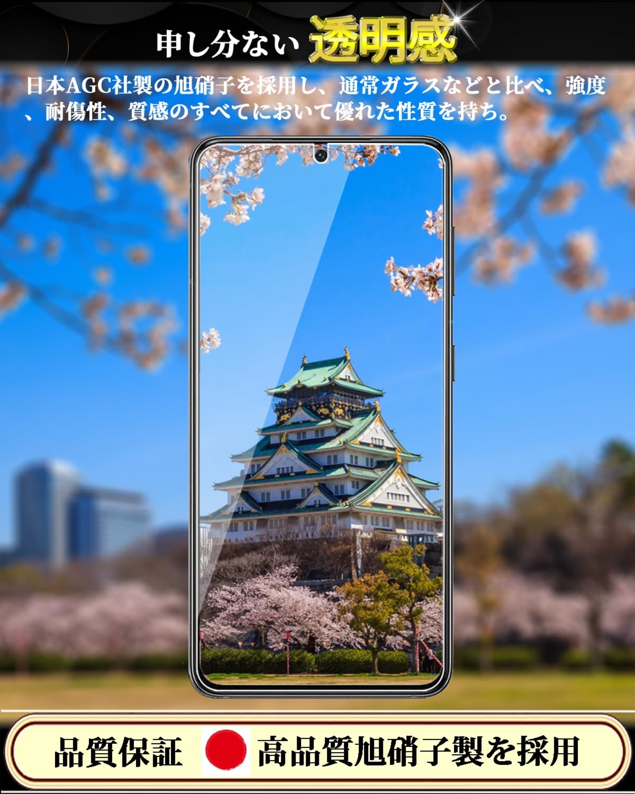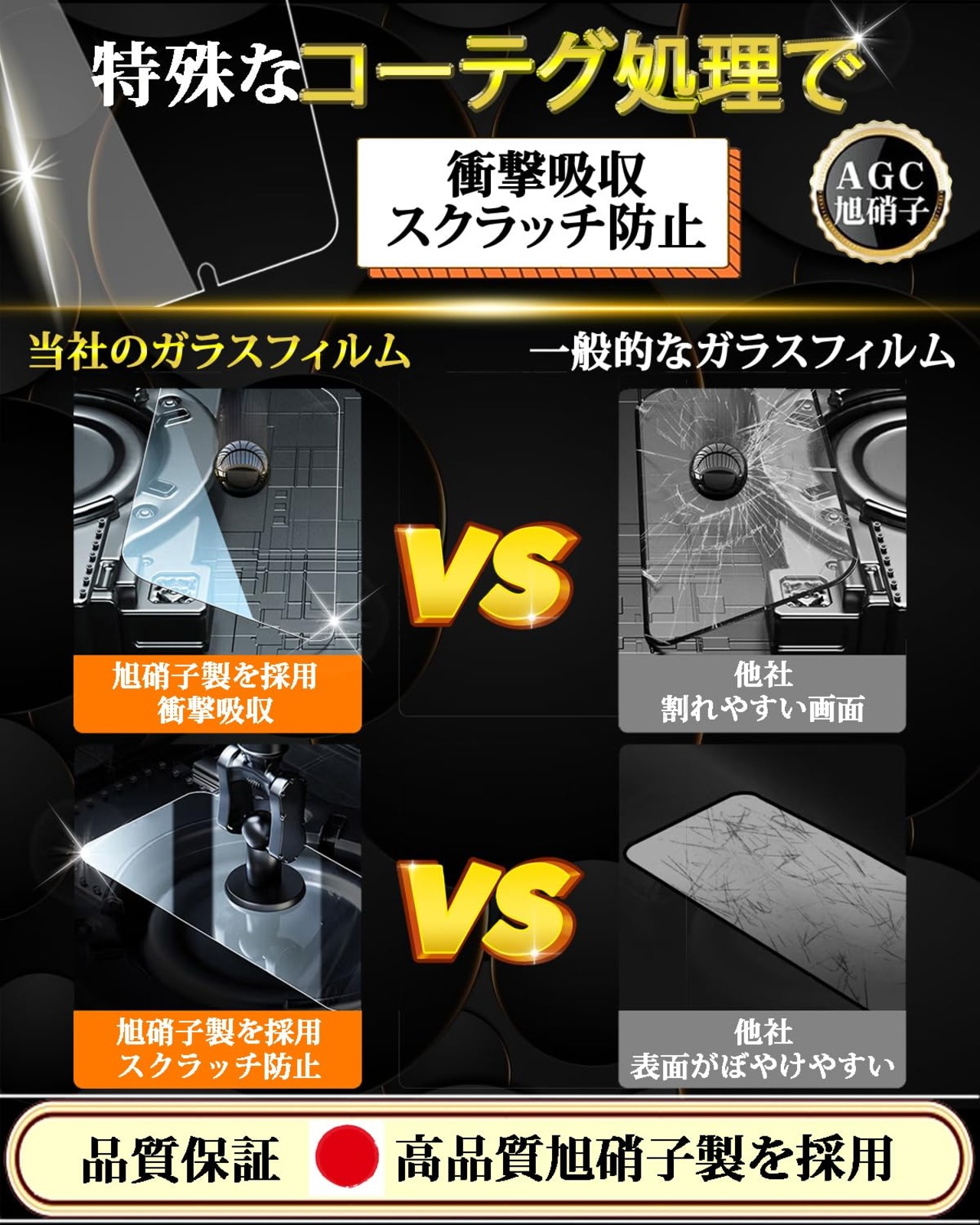 【最強硬度9H・飛散防止】保護ガラス素材は日本旭硝子素材を使用、日本旭硝子社製ガラス素材は通常のPETフィルムより4倍の強度です。スマホのリアルなサイズにより製造、高品質製品の製作プロセスに厳しく基づき、カット加工、精密に彫刻、ライトスイープ、超音波清潔、強化、検査、袋詰め七つのステップを経てスマホに完璧的にフィットした製品を製造されます。