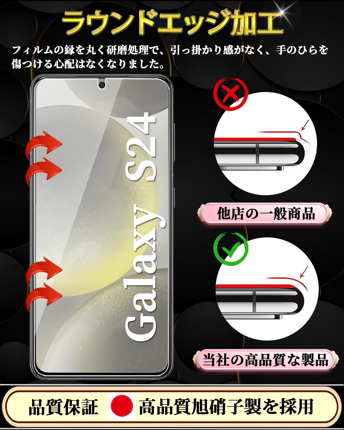 特徴 9H表面硬度,飛散防止,防指紋,撥油コーティング,撥水剤,耐衝撃性,ラウンドエッジ,気泡なし,高透過率,簡単貼り付け