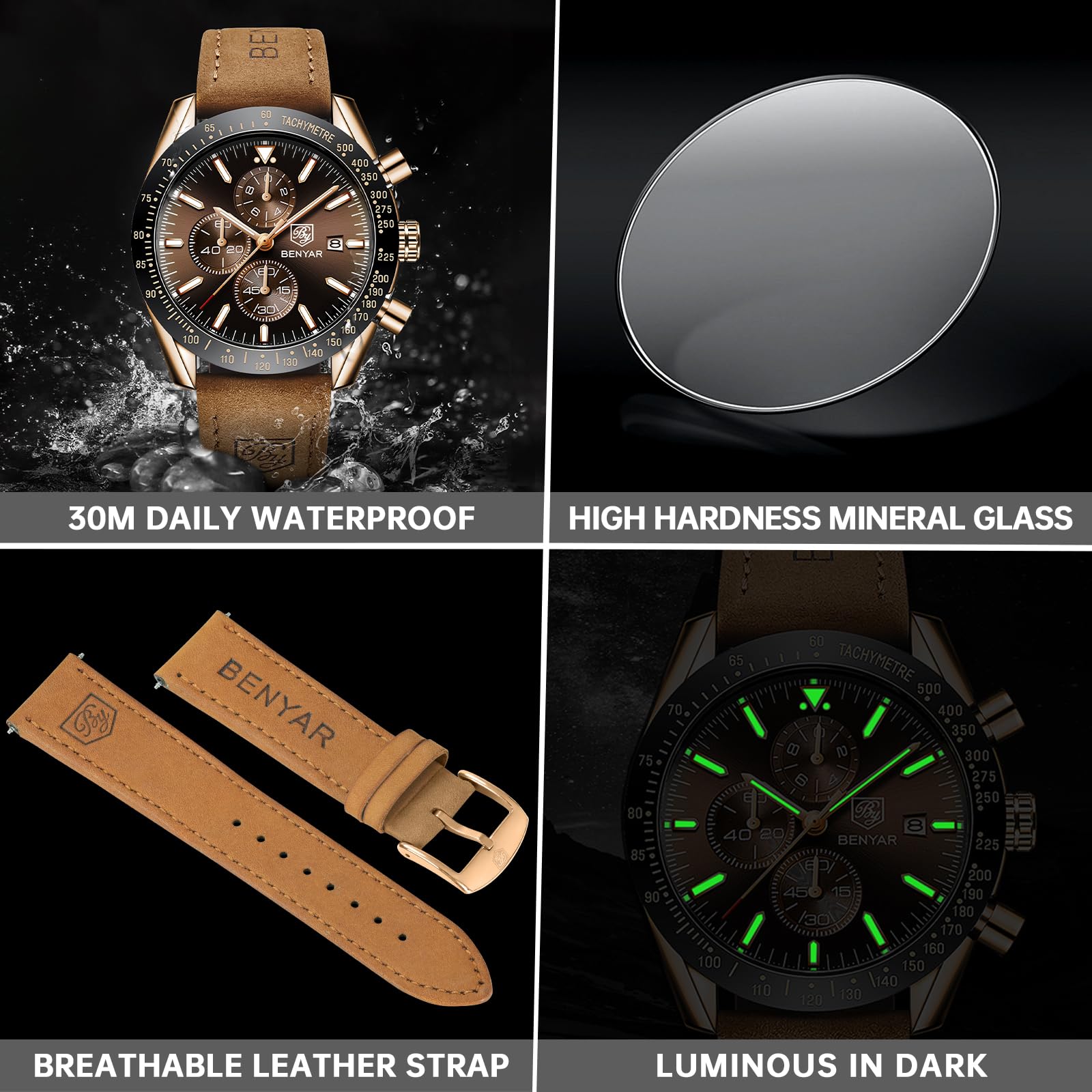 防水レザーウォッチ: レザーストラップの快適さは、その柔らかさと通気性、皮膚に過度の圧力をかけることなく、手首にぴったりとフィット感を確保する男性のためのbenyar茶色の革バンドの時計にある。男性のための3ATM防水時計は、毎日の防水ニーズを満たすことができ、汗、偶発的な雨や水しぶきに耐えるが、入浴、水泳、ダイビングには適していません。十分な光エネルギーを吸収した後、暗い環境で時計の時間を確認することができます。