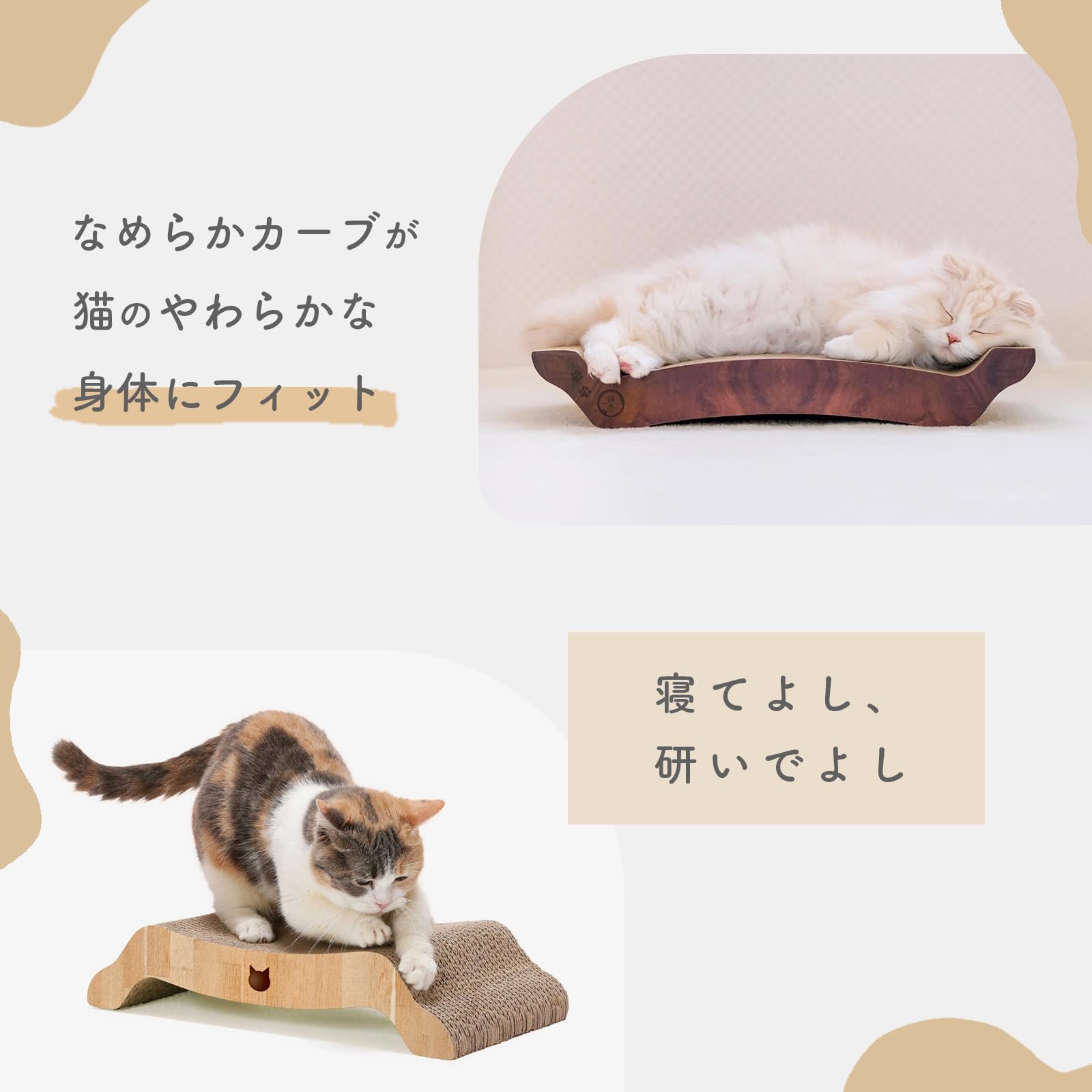 【両面使えてお得】バリバリベッドは、両面ともダンボールになっています。片面がボロボロになった後は、反対面と使えるので、長くお使いいただけます。どちらの面も絶妙な角度のカーブで猫のやわらかいからだにフィットします。