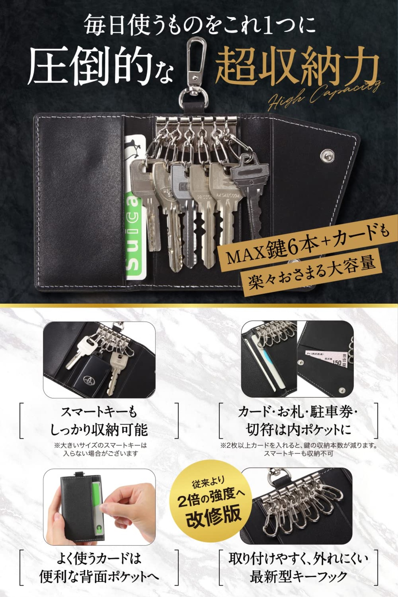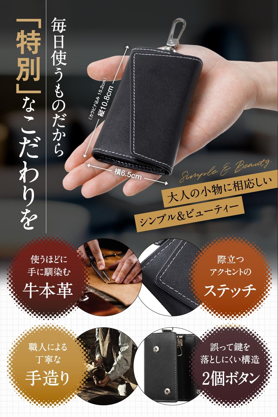 ①【特 徴】メンズ・レディースどちらにもおすすめできるシンプルなデザインでありながら高級感漂う本革製のキーケース。デザインだけでなく、大容量の6連フック、カード収納ポケット、便利なカラビナ付きと、とことんまで機能性を追求。フックは鍵の取り外しがしやすく、なおかつ誤って外れてしまわないタイプを採用。また、開閉に両手を使わないでいいように設計されており、片方の手が塞がっているシチュエーションでも楽々開閉できます。毎日使うキーケースだからこそ細部までこだわりました。自信を持ってお届けできる一品です。