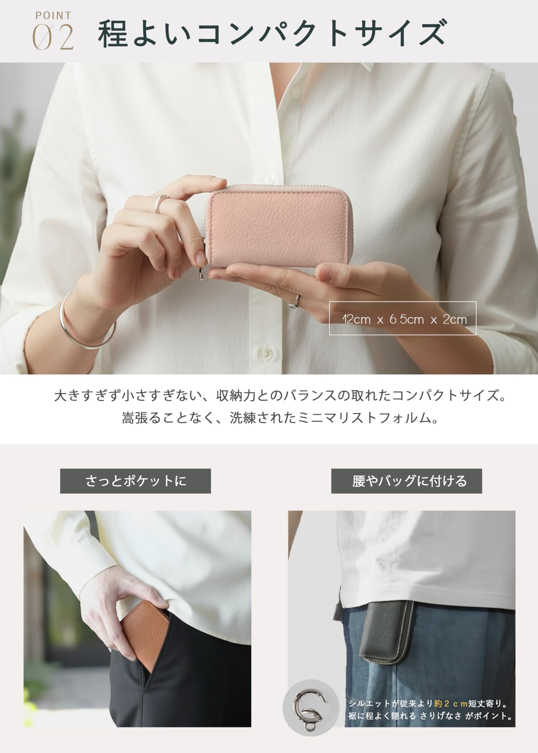 ファスナートップは丸型カラビナ。指にひっかけて持ったり、ベルトループやバッグ等にぶら下げる事ができます。掴みやすいのでファスナーの開け閉めがしやすいのもポイントです。