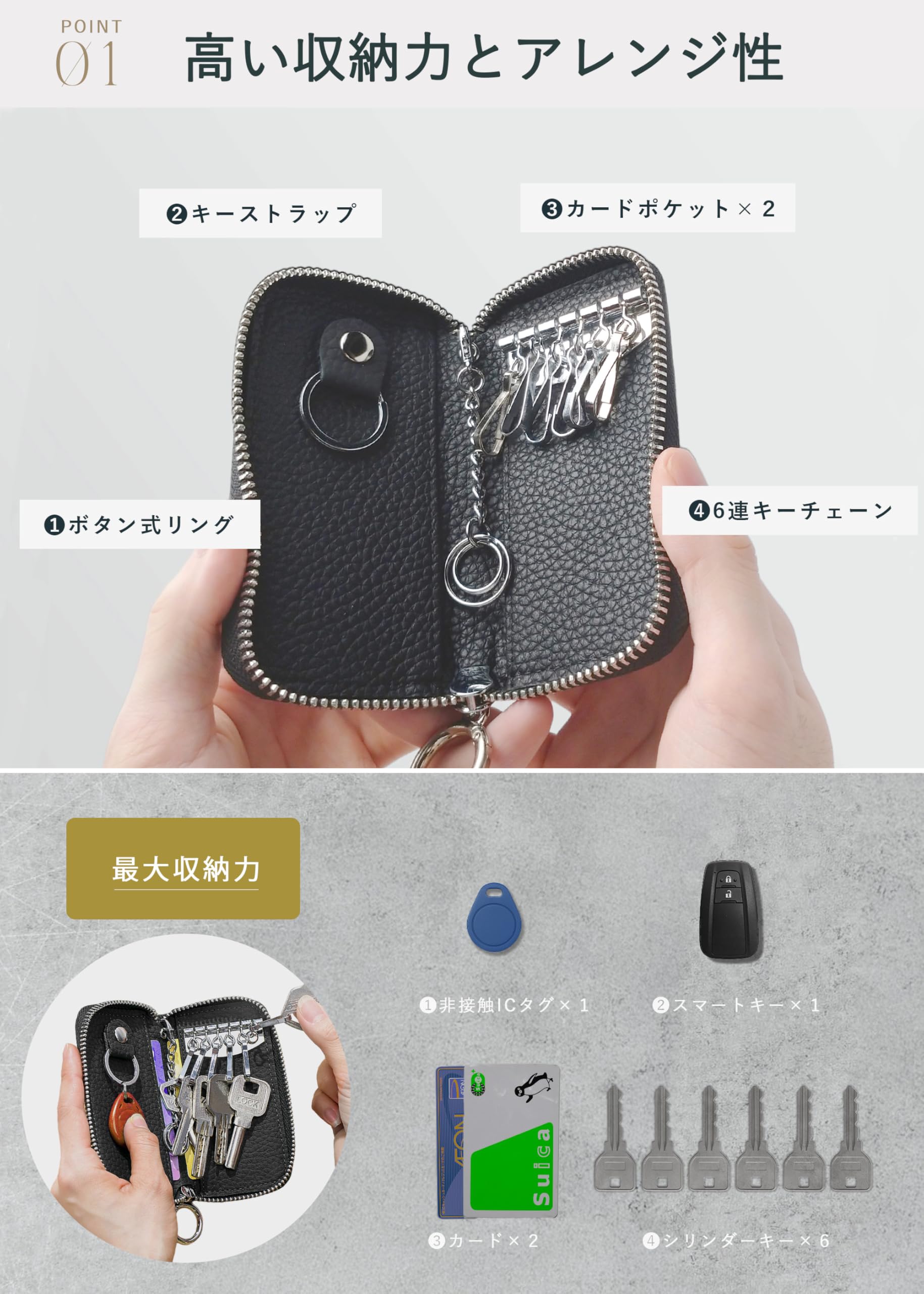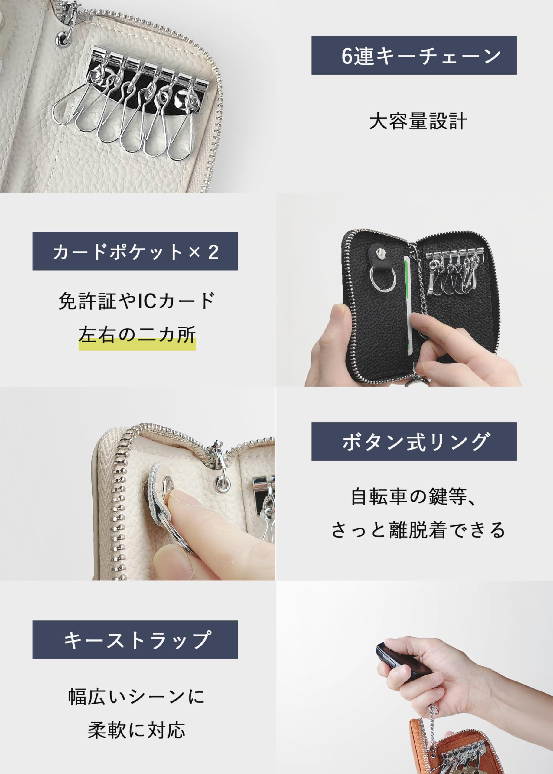 [ELEGANCE-e] キーケース スマートキーケース スマートキー対応 メンズ レディース 本革 シボ革 コンパクト 小さめ 6連 カードポケット付き 大容量 ファスナー