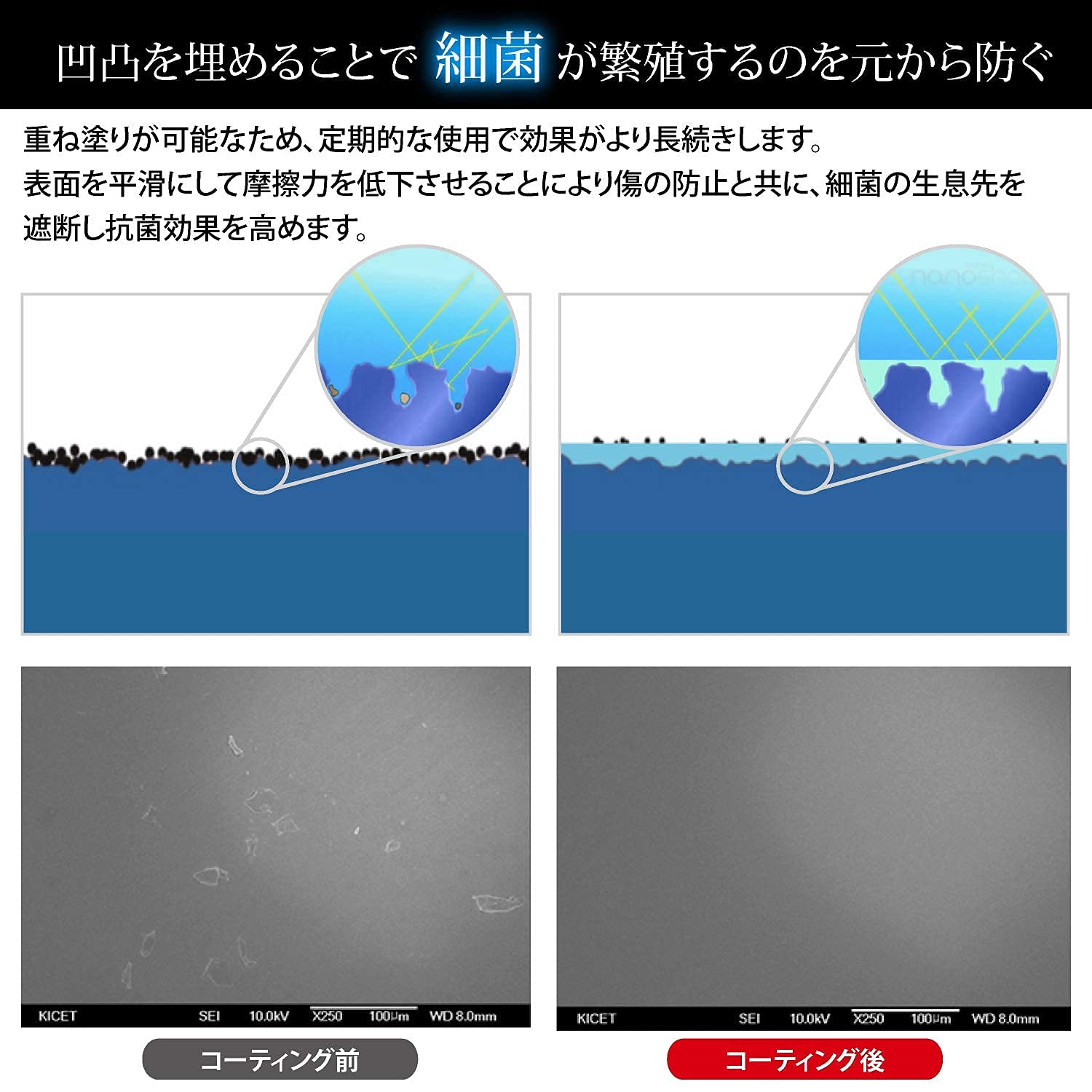 【汚れ・細菌を防ぐ抗菌効果】 表面を膜で平滑にして細菌の入るスペースを減らし、ほとんどの細菌から防ぎます。また、有機溶剤、洗剤などは一切含まれておらず、直接触っても人体に影響なく安全です。