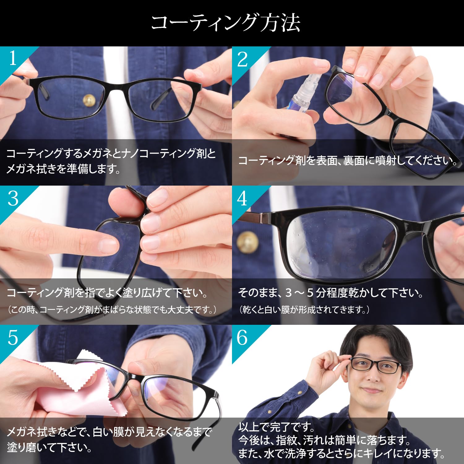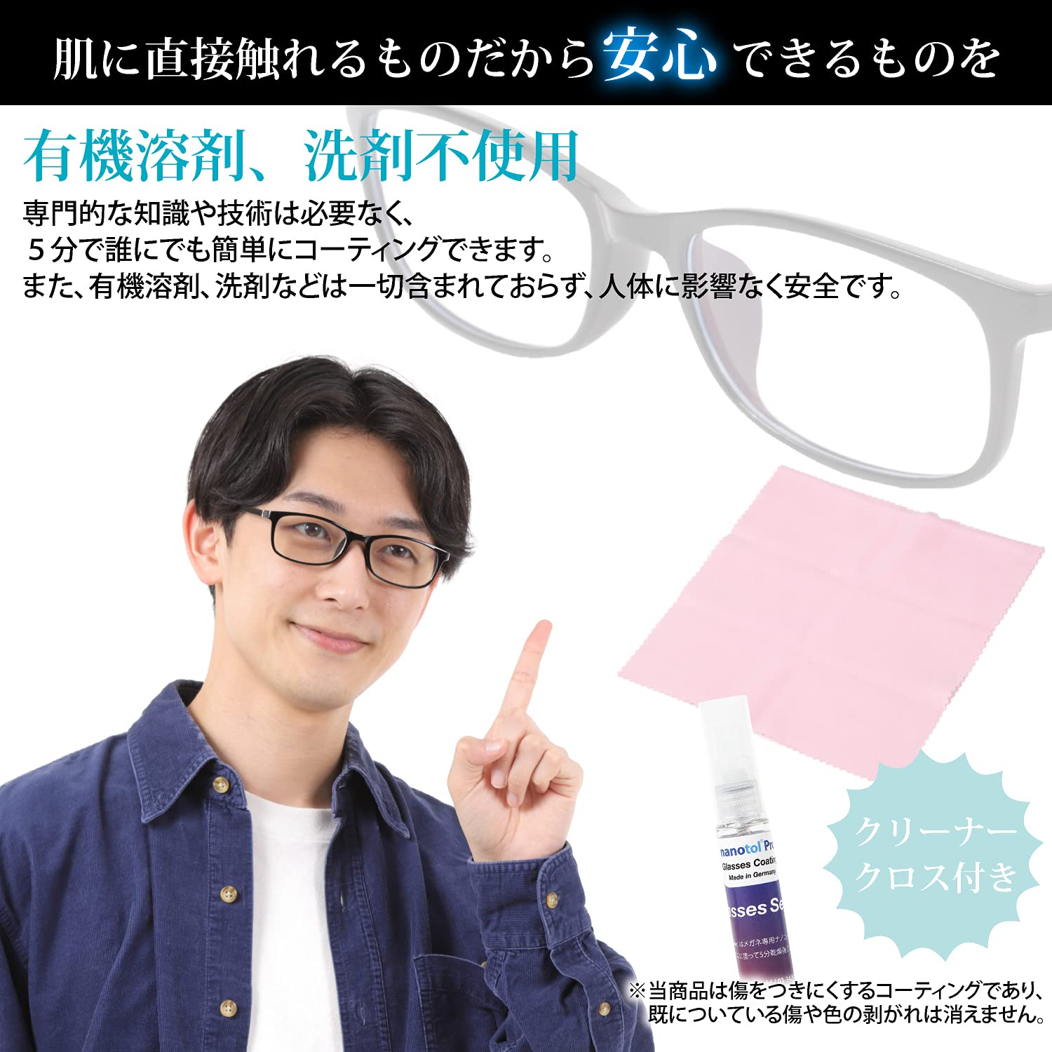 【メガネクリーナー不要】 コーティング後は、メガネレンズに汚れが付着しても水だけでメガネクリーナーのように簡単に洗浄できるようになります。ナノポリマー重合反応によって膜を形成し、表面が親水性になることで、汚れが付着しずらく、落ちやすくなります。メガネ拭きやクロスだけでも汚れが簡単に落ちます。
