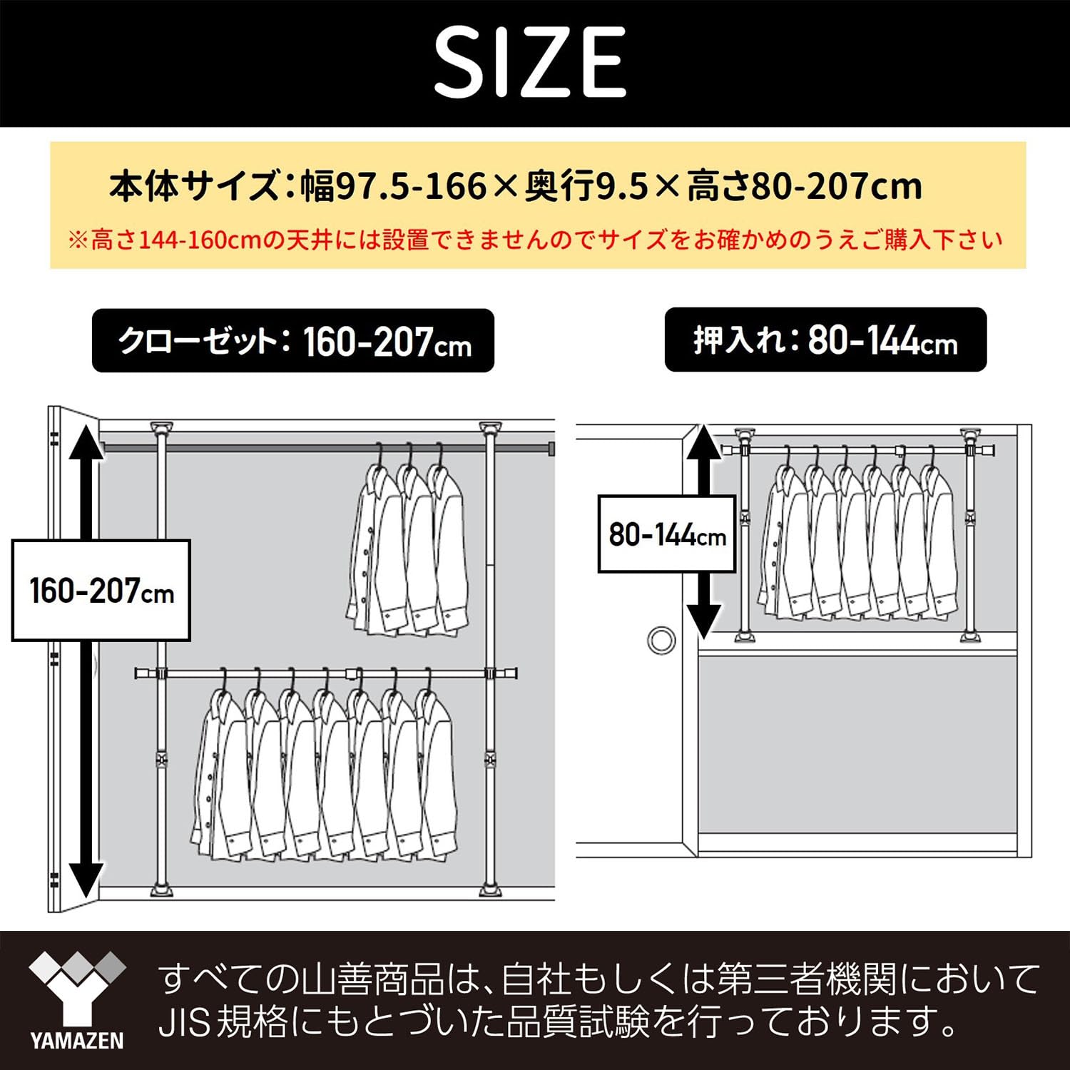 ●本体サイズ:幅97.5-166×奥行9.5×高さ80-207cm※高さ144-160cmの天井には設置できません●全体耐荷重:30kg●取扱・組立説明書付き●東証プライム(株)山善で扱うすべての山善商品は、自社もしくは第三者機関において、JIS規格に基づいた品質試験を行っております。