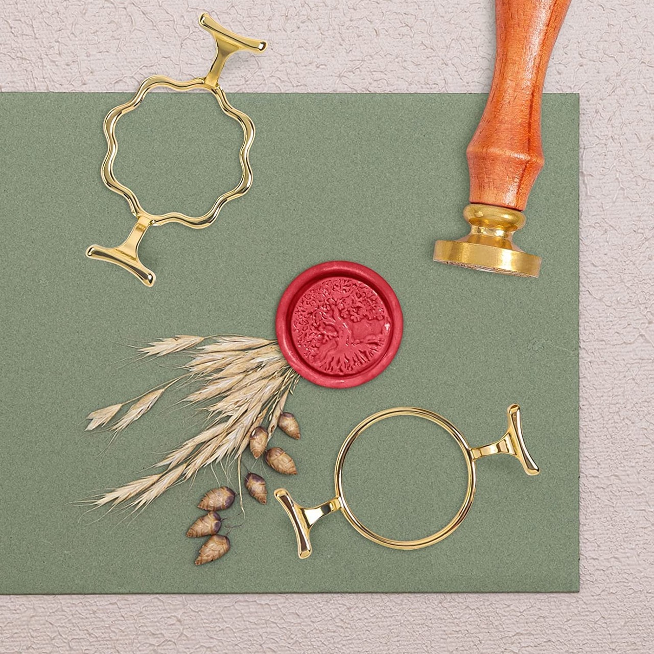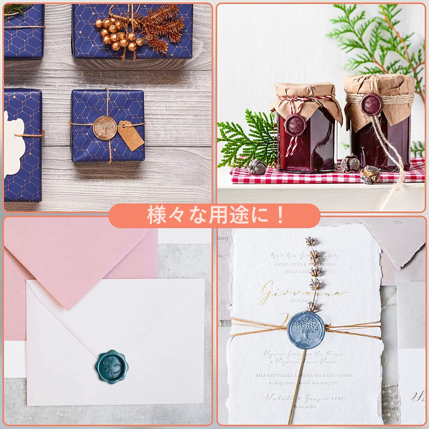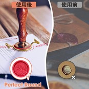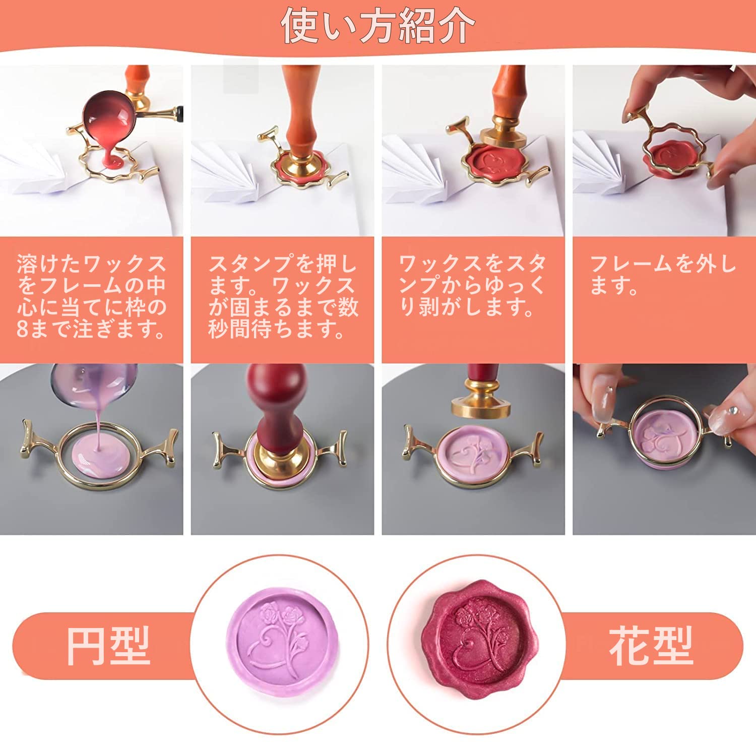 【使用方法】1.封筒またはスタンプ台にフレーム置き、溶かたワックスをフレーム中心に当て、枠の8分まで流し込みます。2.スタンプをワックスに押します。3.ワックスが固まったら、スタンプを剥がします。4.フレームをワックスから外します。