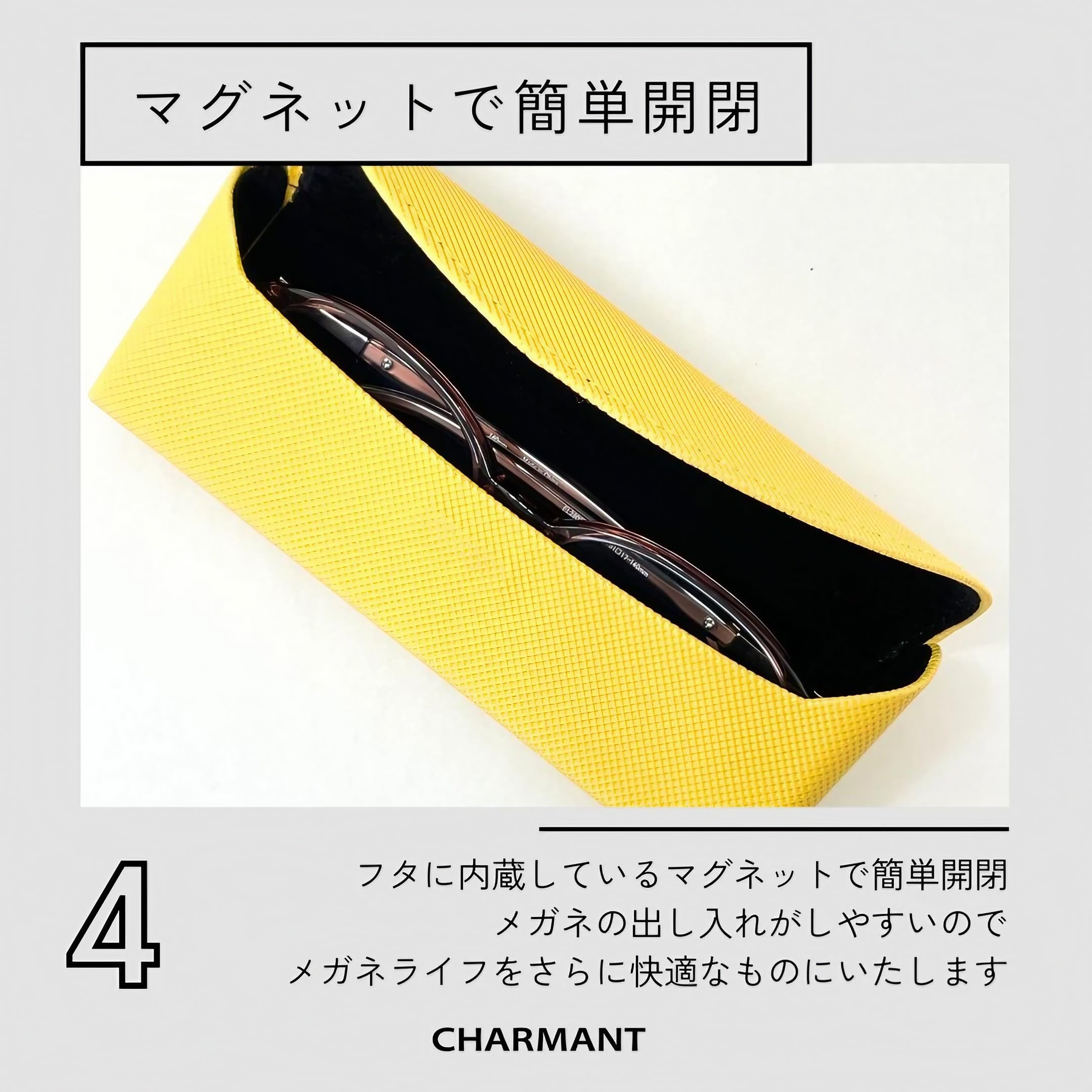 【使いやすいマグネット式】 フタに内蔵しているマグネットで楽に開閉することができます。出し入れもしやすく、メガネライフをさらに快適なものにいたします。