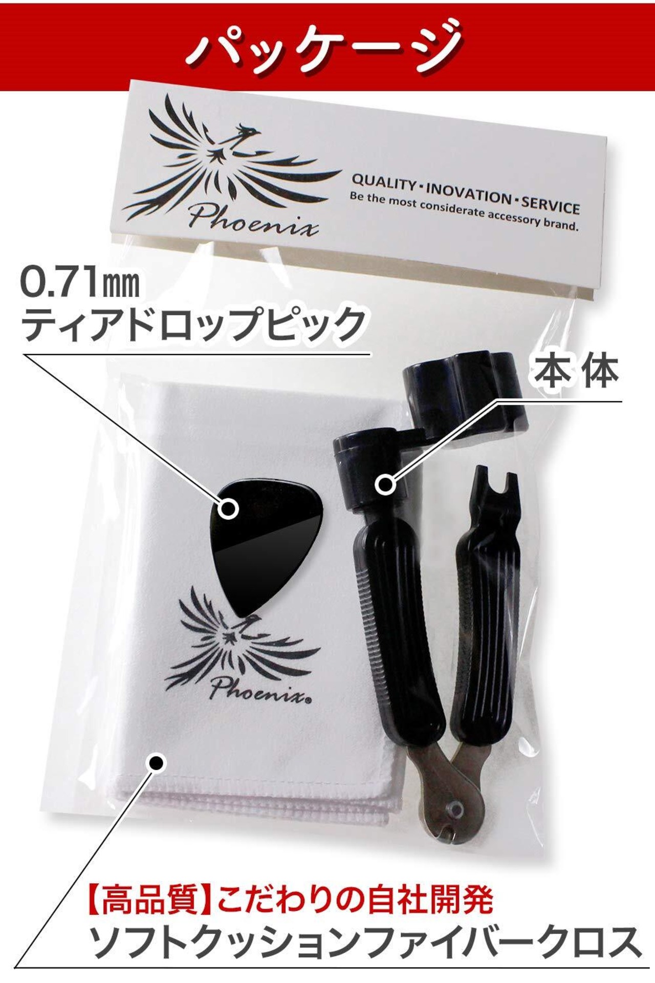【数量限定】Phoenix ストリングワインダー アコースティックギター 弦 メンテナンス ( ペグ回し ブリッジピン抜き ニッパー ) ファイバークロス/ピック/メーカー長期書<4点セット>Black(ブラック)
